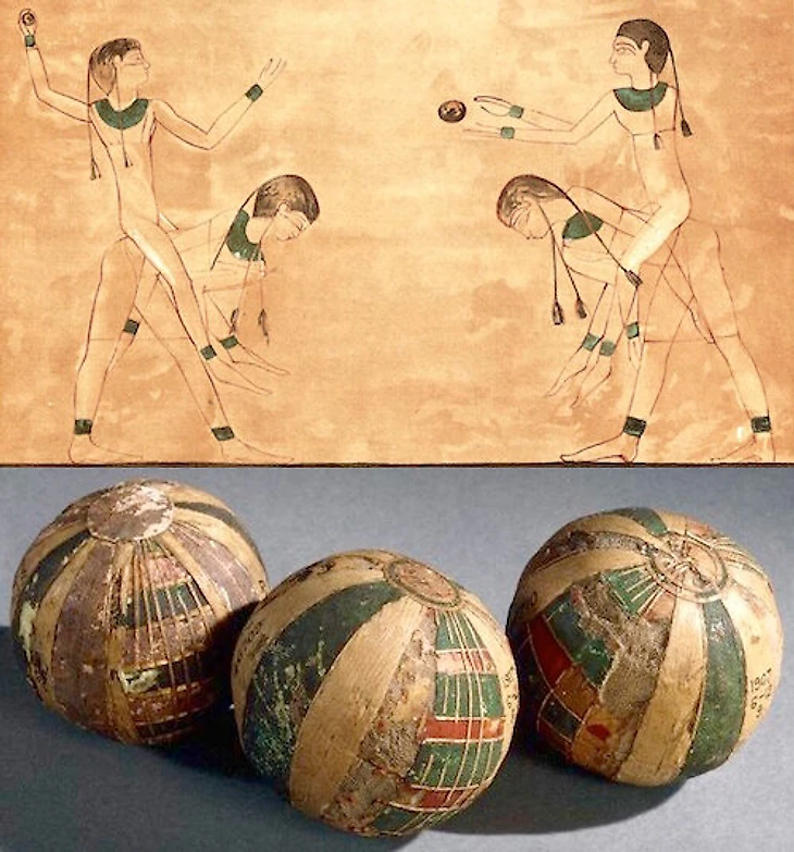 Хотя самый древний мяч нашли не в Египте, а в Китае. Небольшие шарики диаметром 7-9 сантиметров (примерно как мячи для гольфа) с сердцевиной из волос и покрытием из кожи обнаружили на северо-западе Китая недалеко от города Турфан. Им примерно три тысячи лет.