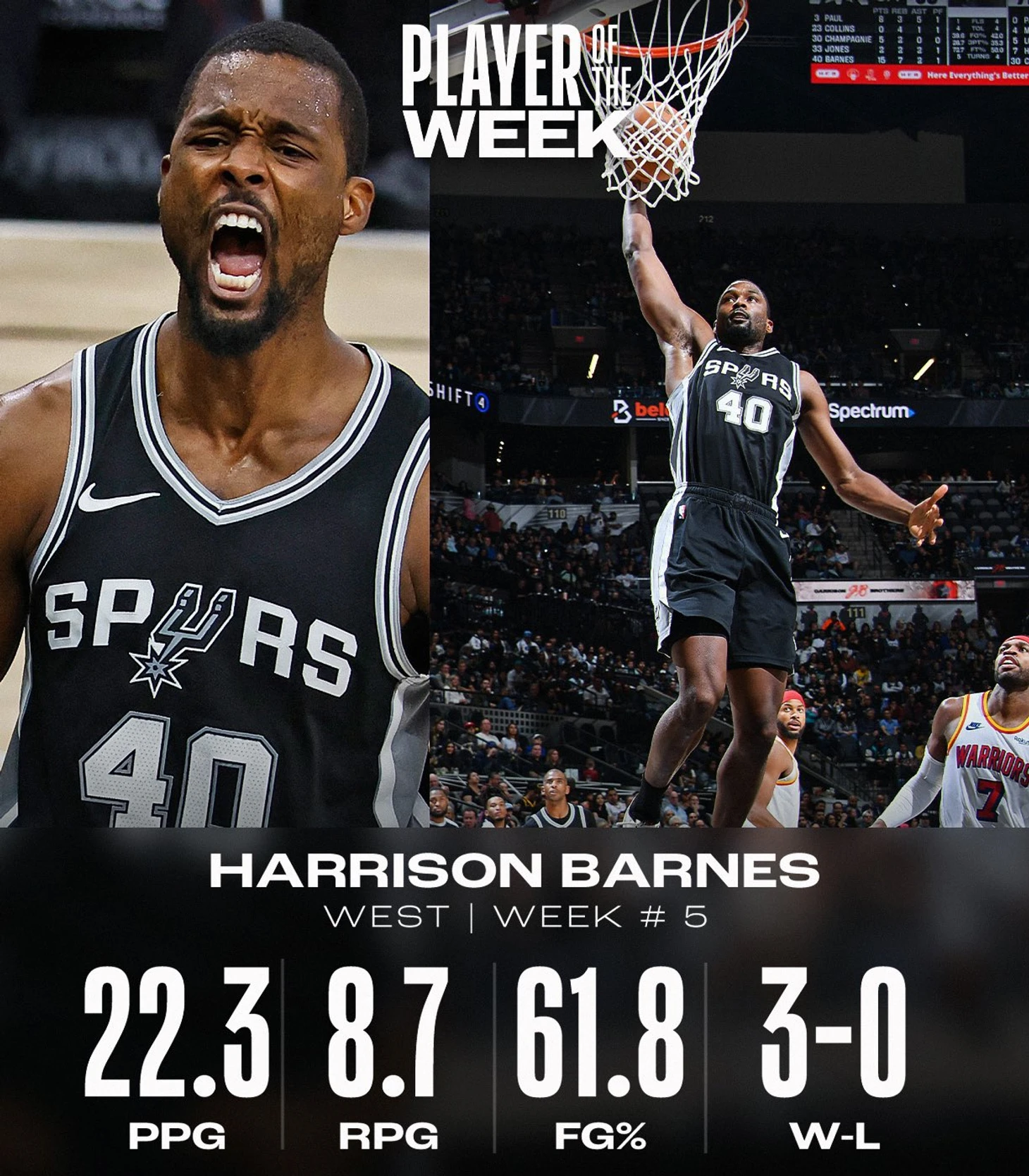 Сперс и так шли в районе положительного соотношения (В-П) на жестком западе, поэтому даже мини-серия (3-0) из трех подряд домашних побед стала достаточным условием, чтобы наградить забытого всеми Харрисона Барнса. Веса этим победам конечно добавляет то, что повержены были оба лидера западной конфы: Оклахома (110:104) и ГСВ (104:94). Допустим хорошая заявка. Но...про «любимчиков» и про то, как лига расставляет фокус своего внимания.
