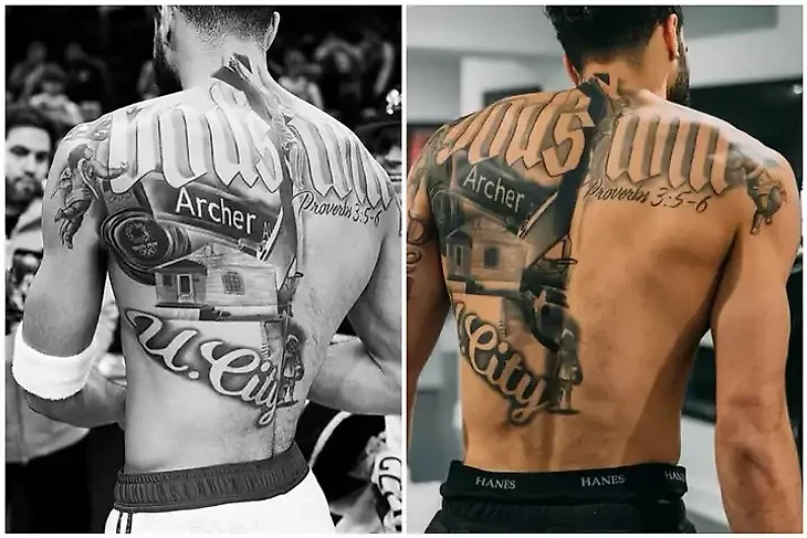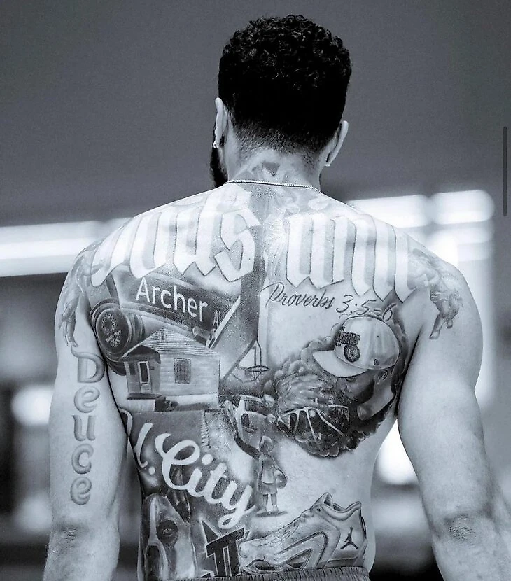 Все самое важное и значимое для Тейтума так или иначе вытатуировано на его спине. Огромный коллаж, который игрок «Селтикс» носит как плащ, регулярно пополняется новыми элементами. Среди тех, что были замечены ранее: