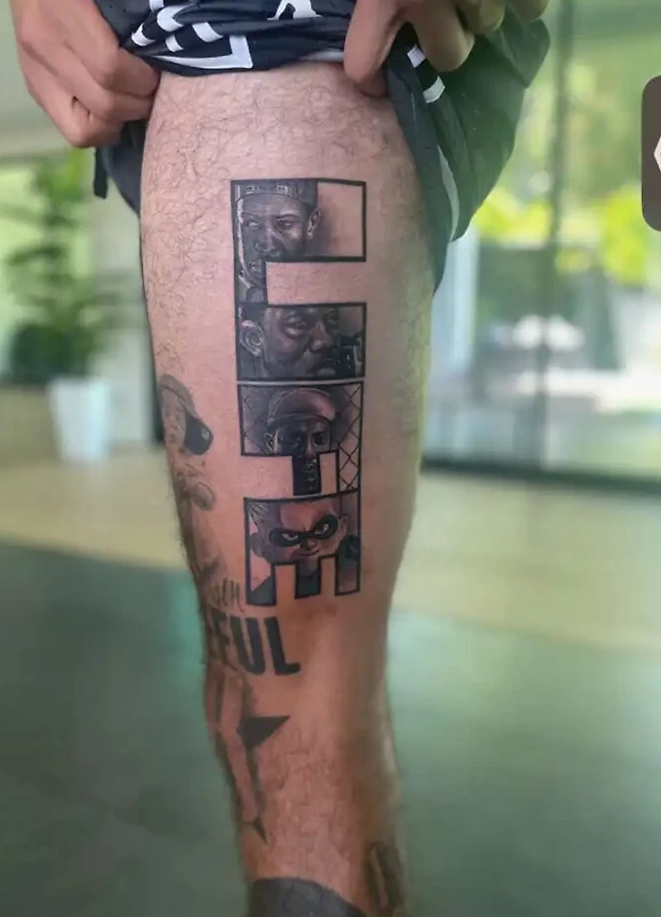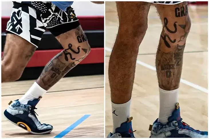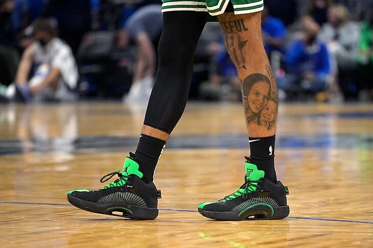 Ну и куда же без культурного влияния. На ноге у игрока – замысловатый и остроумный коллаж, объединяющий в себе четверых киноактеров в ролях, памятных для Тейтума: