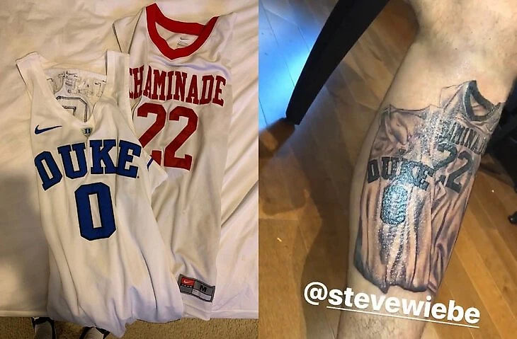 Продолжая цикл татуировок тематики «Чтобы помнили», Джейсон решил увековечить на теле изображения собственных игровых маек. С левой икры у него «свисает» майка баскетбольной команды школы Чеминейд с номером 22, а рядом красуется более привычная форма университета Дьюк с номером 0.