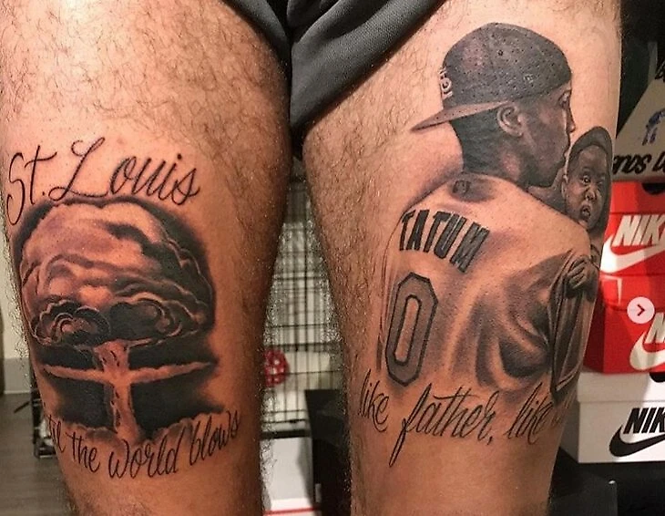 Над правым коленом у Тейтума своеобразное посвящение дому – пейзаж, взрыв атомной бомбы и подпись «Сент-Луис, пока мир не взорвется». Подразумевается, что именно до того момента Тейтум будет предан родному городу.