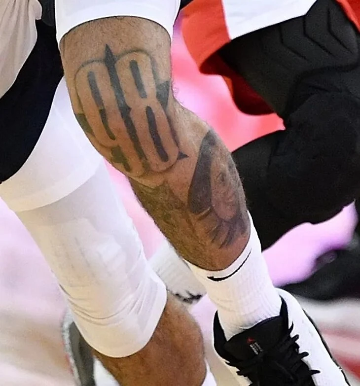 На колене – массивная тату с цифрой 98 и огромной черной звездой на заднем плане. Ребус, в целом, нехитрый. Тату напоминает о статусе Джейсона и годе его рождения (Тейтум появился на свет 3 марта 1998 года).