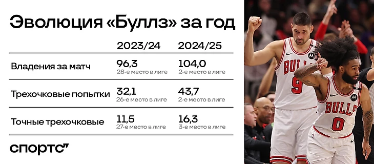 В сезоне-2024/25 в «Чикаго» приняли любопытное решение – клуб резко изменил профиль. В межсезонье Демара Дерозана, который грешил любовью к неспешным изоляциям и средним броскам, отпустили в «Сакраменто». Без него «Буллз» выкрутили на максимум темп игры и решили сделать ставку на атаки с дальней дистанции: одна из пяти самых медленных и небросающих команд прошлого сезона превратилась во вторую-третью по темпу и трехочковым: