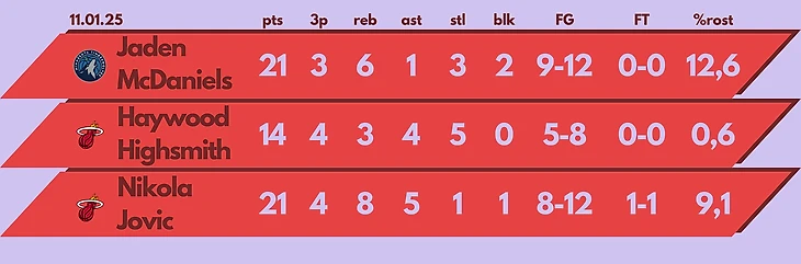 Всего 4 матча лиги, зато какие имена в нашем топе! Джэйден МакДэниелс на пару с Донте тащили Миннесоту на фоне хромающего Энта, но чутка не дотащили. Хэйвуд Хайсмит и Никола Йович поняли, что при остутствующем Батлере помогать Хирро и Бэму должны вообще все (жалко что Данкан Робинсон не понял).