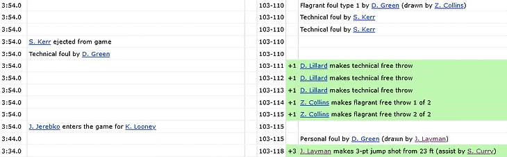 Вроде бы ничего особенного – Дрэймонд даже до мяча дотянулся, так что бывает и хуже. Но судьи назначили неспортивный фол, и это решение зверски возмутило Стива Керра. Тренер «Уорриорз» разве что не подрался с судьей, за что вполне справедливо получил два технических и был удален с площадки. Сам Грин тоже получил технарь. В результате всей этой заварушки «Портленд» пробил пять штрафных подряд, реализовал все пять, а поскольку все это были технические штрафные – и сохранил владение. В последующей атаке Джейк Лэймен забил трехочковый и вуаля. Этот результат по-прежнему остается рекордным по очкам за владение в НБА.