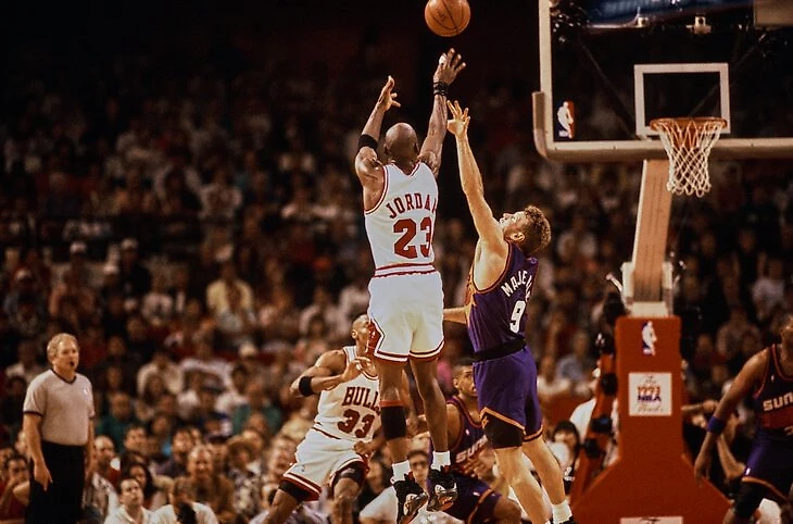 Технику броска с отклонением Джордан отполировал уже после возвращения из бейсбола, то есть после 1995 года. На старте карьеры Майкл предпочитал обыграть соперника лицом к лицу, но по мере старения взял на вооружение игру спиной к кольцу и превратился в ведущего апологета средних бросков. Вспомните любой знаменитый победный бросок Джордана – высока вероятность, что это будет бросок как раз с 4-6 метров.