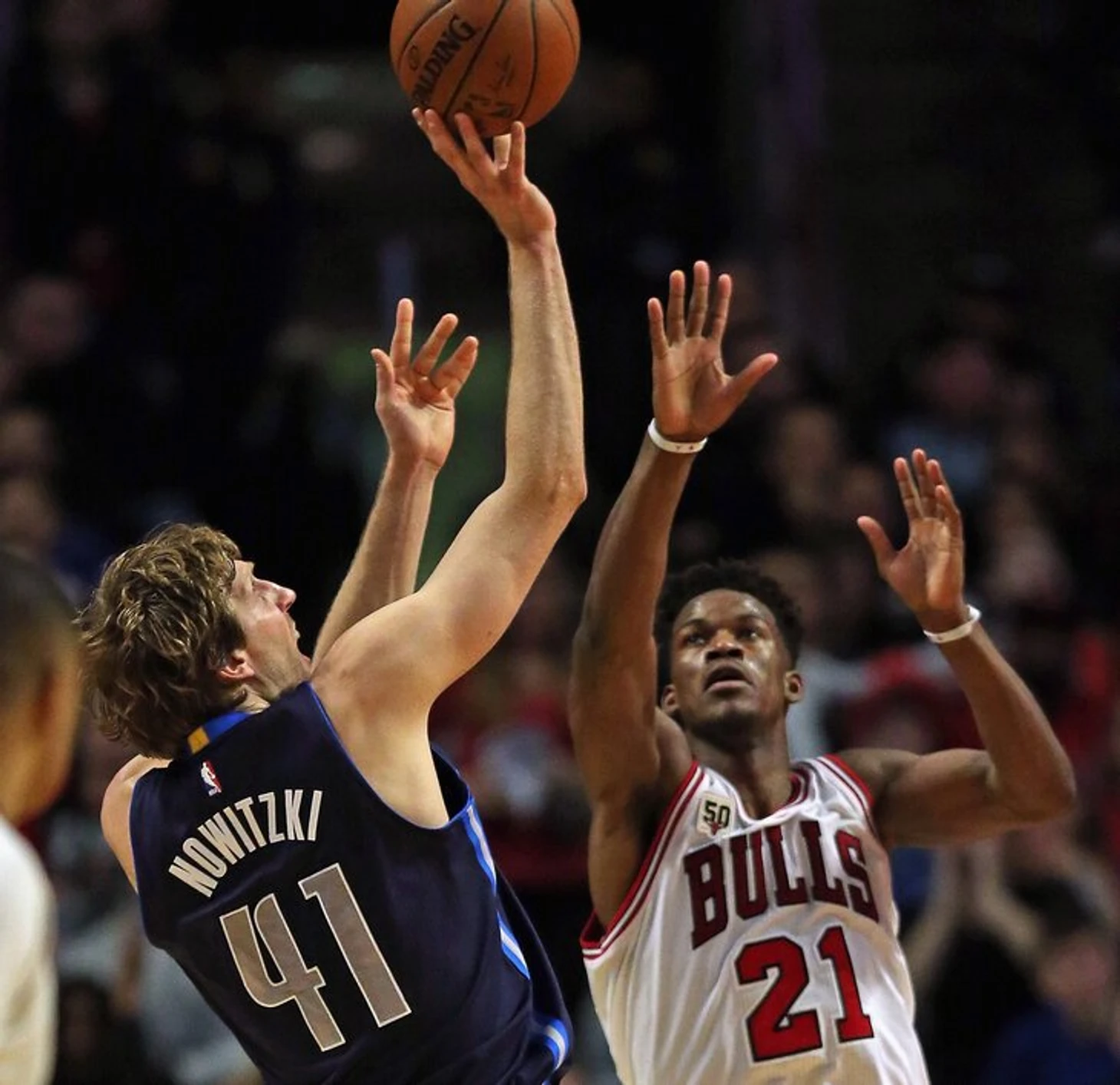 Но если Кобе воспроизвел то, что уже практиковали до него, то Дирк Новицки сумел добавить в этот рецепт новый ингредиент. Немецкий здоровяк не просто бросал с отклонением, но делал это с одной ноги и выпячивал второе колено вперед, чтобы дополнительно обезопасить себя от защитника. В итоге коронный прием Новицки стал настолько культовым, что ему даже памятник установили именно в такой позе.