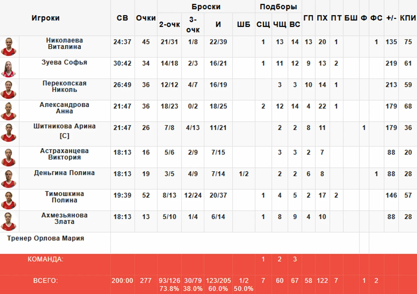 Поставленную задачу они блистательно выполнили: команда Калининского района уступила со счетом 10:277 (3:42, 0:52, 3:87, 4:96). У соперниц – квадрупл-дабл и три трипл-дабла с перехватами (!)
