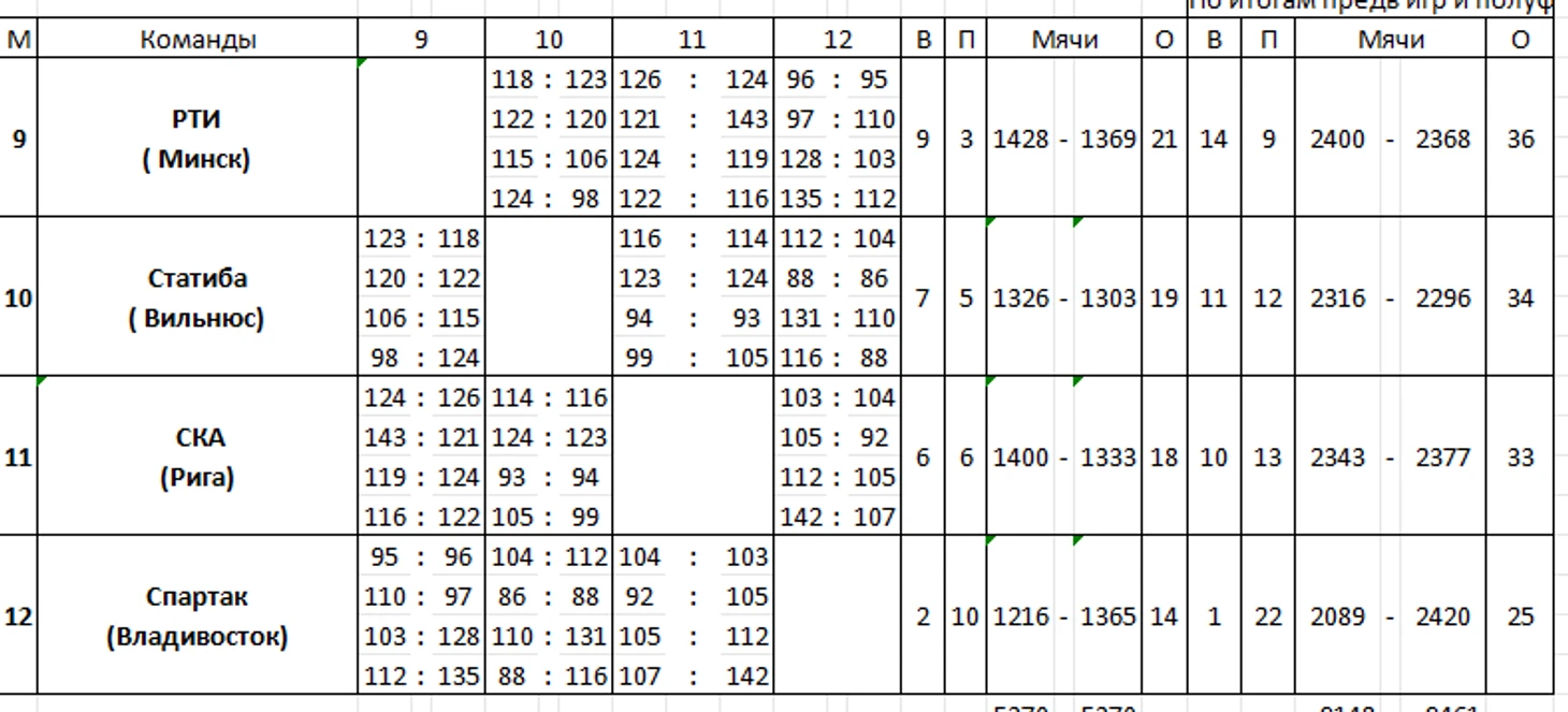 Ситуация в нижней четверке (играли по 4 матча каждый с каждым): РТИ – 13-10 (9-3), «Статиба» – 11-12 (7-5), СКА Р – 10-13 (6-6), «Спартак» Вл – 2-21 (2-10).