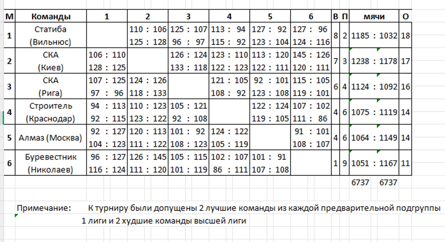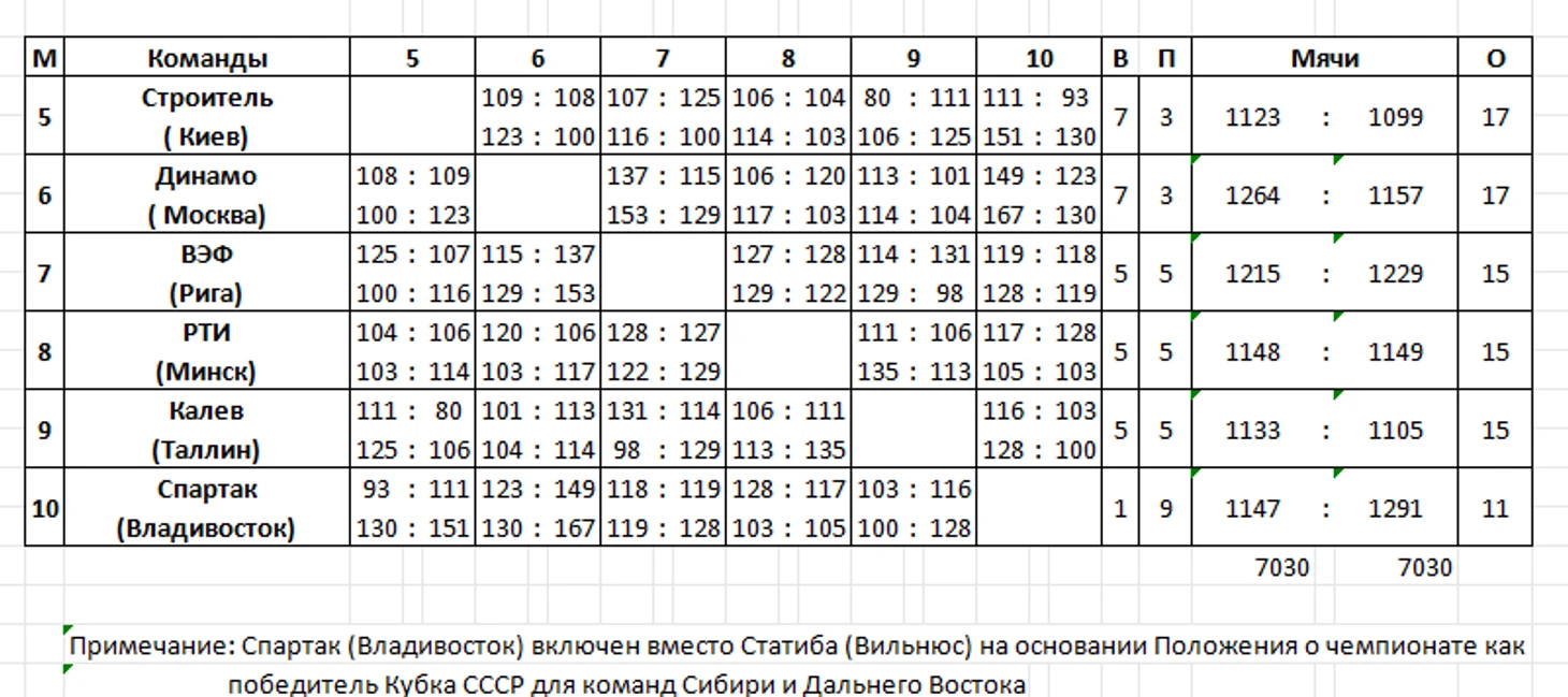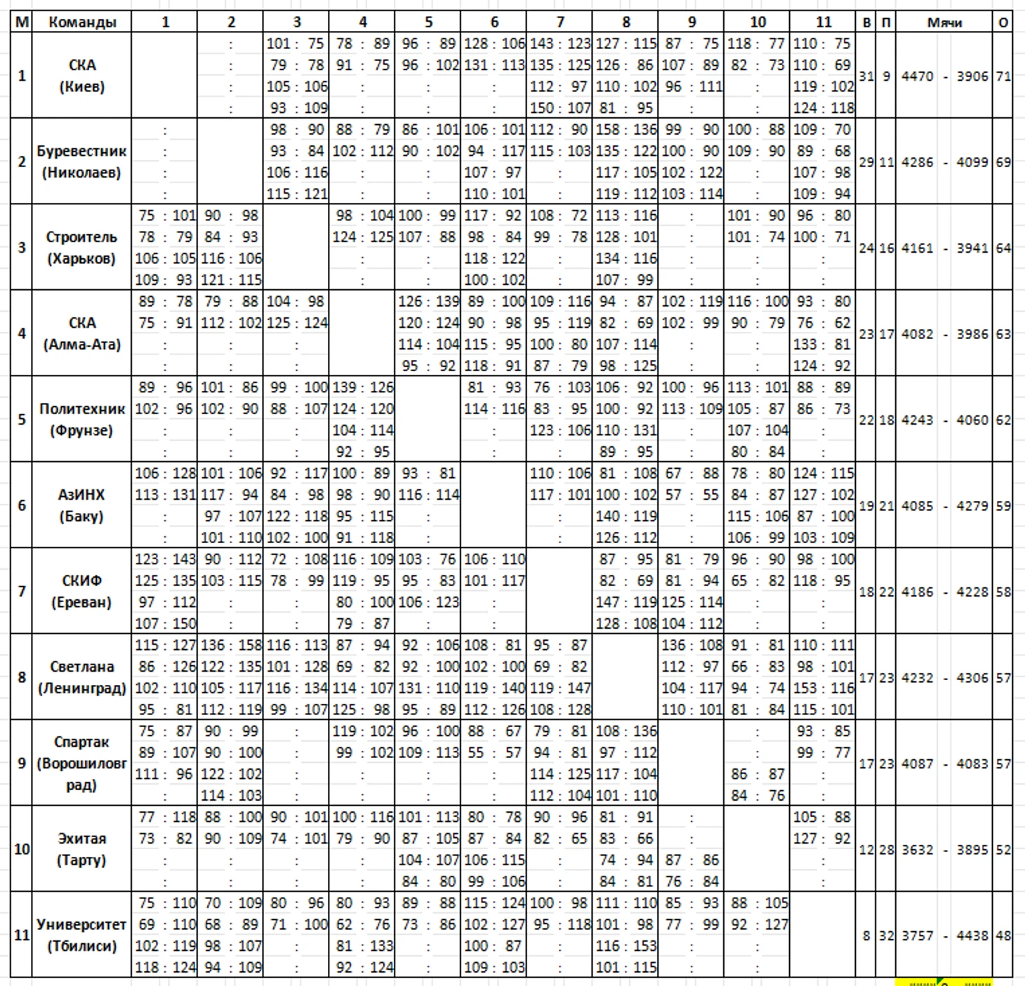 Каунасский клуб после провала в Таллине, дома одержал 5 побед. Как и ленинградцы, достойно выступили московские динамовцы – 4 победы. А вот «Строитель» (трудно без Сальникова) и ВЭФ (дебютант, как никак) не выдержали напряжения – по 4 поражения в Каунасе.