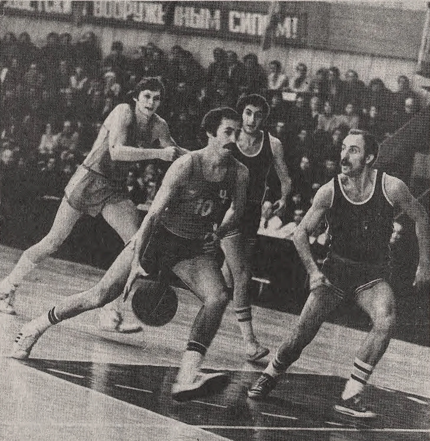 6 декабря, второй день тбилисского тура. Пока «Динамо» (Тбилиси) выигрывает у «Спартака» – 27:21. Николай Дерюгин (с мячом) против Михаила Силантьева. Рядом Геннадий Капустин, на линии штрафных – Александр Белов, который вскоре, набрав всего 2 очка, покинет площадку из-за перебора фолов