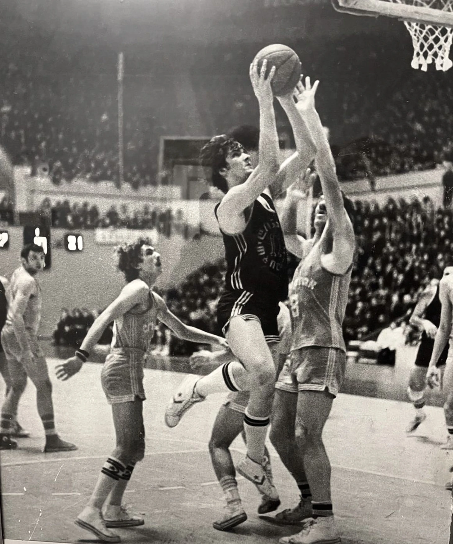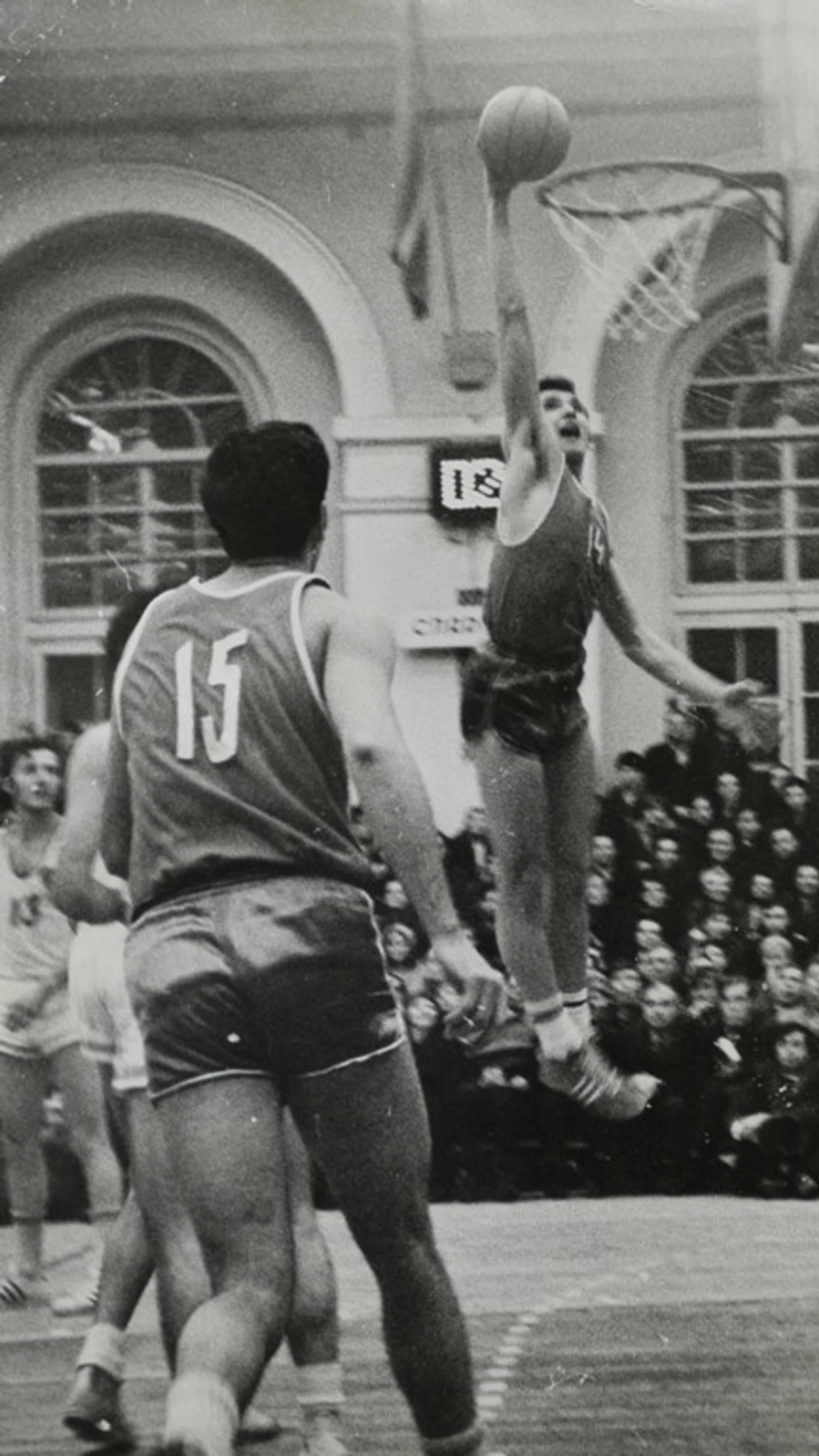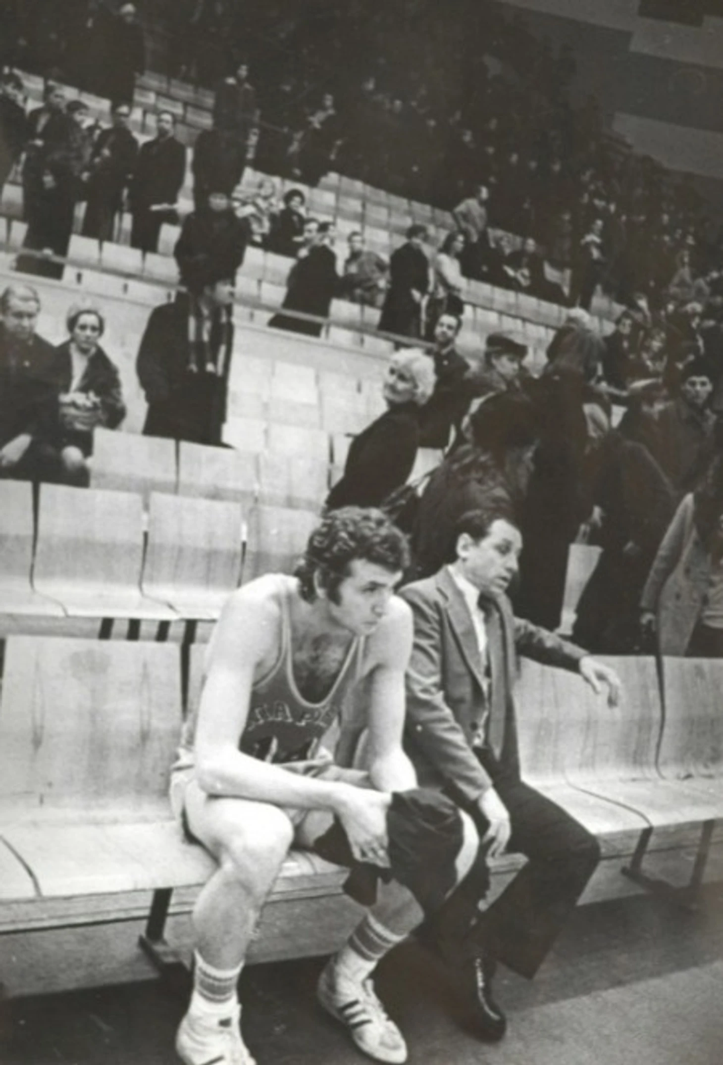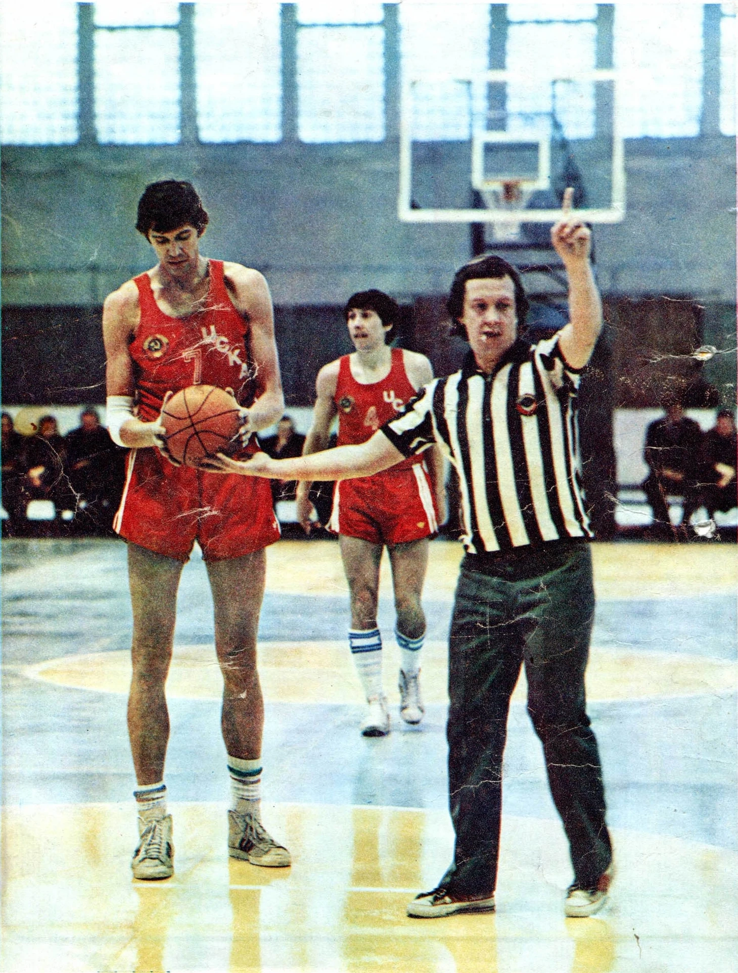 Это примечательное фото было сделано во Дворце спорта Тбилиси 5 декабря 1977 года в день открытия XLV ЧЕМПИОНАТА СССР (ВЫСШАЯ ЛИГА-1977/78). Ленинградский «Спартак» против минского РТИ. Запечатленный на снимке центровой Александр Белов проводил свой первый официальный матч после почти 10-месячной дисквалификации. Набрал, кстати, 12 очков. Тараканов добавил 29. «Спартак» выиграл – 94:74.
