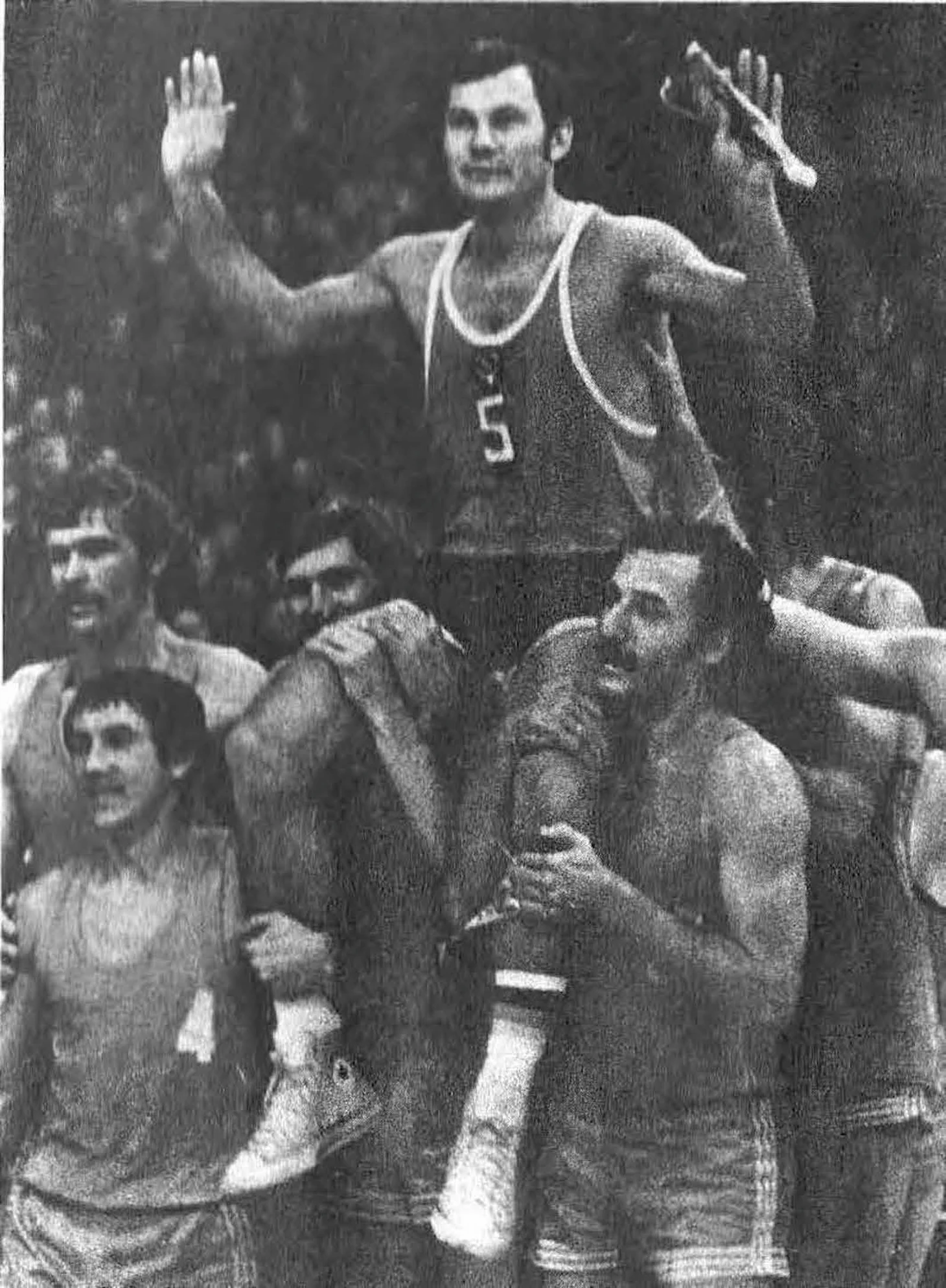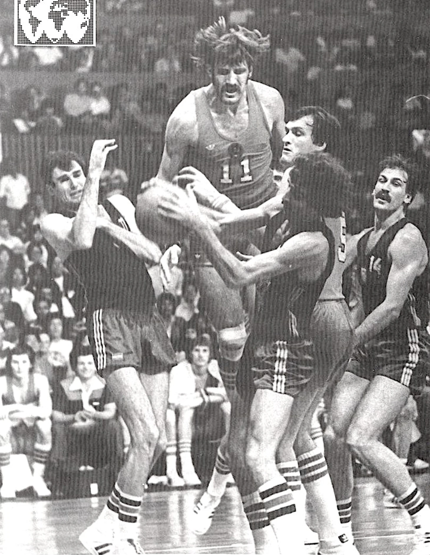 Владимир Ткаченко (№ 11), как и схвативший мяч Драган Кичанович, а также Дражен Далипагич (№ 14) вошли в символическую пятерку по итогам чемпионата мира-1978. Слева – легендарный капитан сборной Югославии Крешемир Чосич (№ 11), помогает нашему центровому Александр Болошев (№ 5)