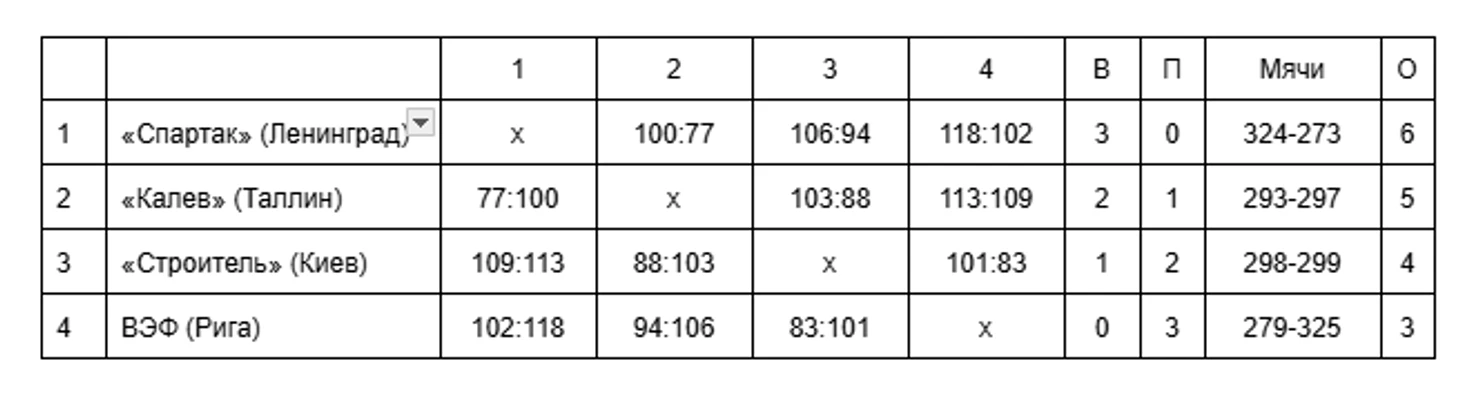 Первый день. «Спартак» – «Калев» – 100:77. «Строитель» – ВЭФ – 101:83. Второй день. «Калев» – «Строитель» – 103:88, «Спартак» – ВЭФ – 118:102. Третий день. «Калев» – ВЭФ – 113:109, «Спартак» – «Строитель» – 106:94. Итог: «Спартак» – 3-0, «Калев» – 2-1, «Строитель» – 1-2, ВЭФ – 0-3.
