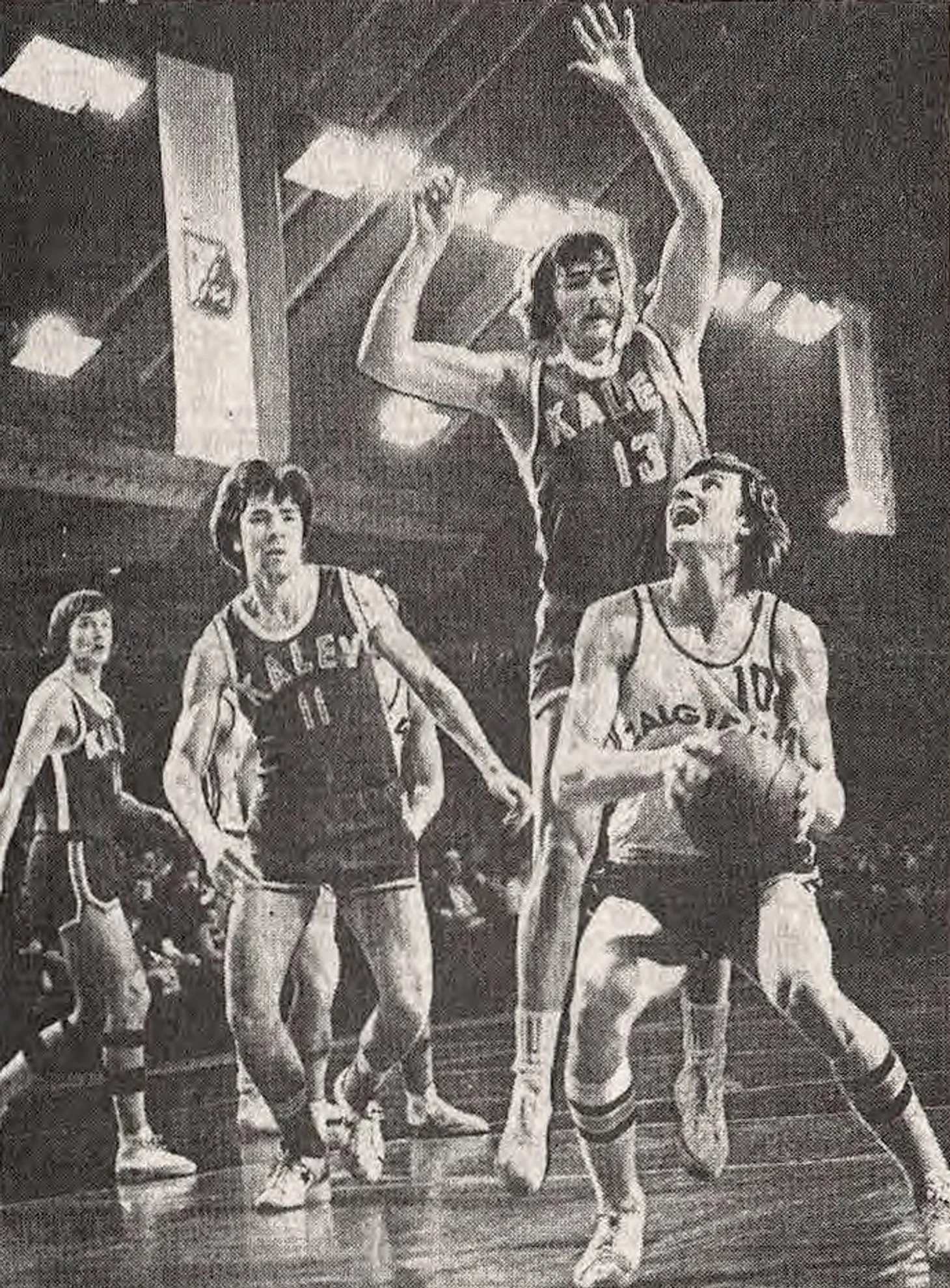 3 декабря 1977, в день открытия чемпионата, Юло Варул, Рашид Абельянов (№ 11), Яан Лентсиус (№ 13) и их партнеры по «Калеву» обыграли Людаса Жукайтиса (с мячом) и его «Жальгирис» – 88:79. Клуб из Каунаса потерпел в Таллине еще три поражения