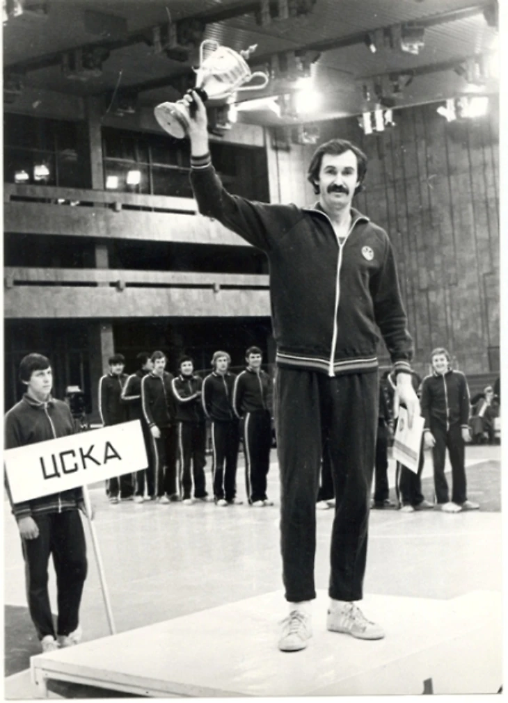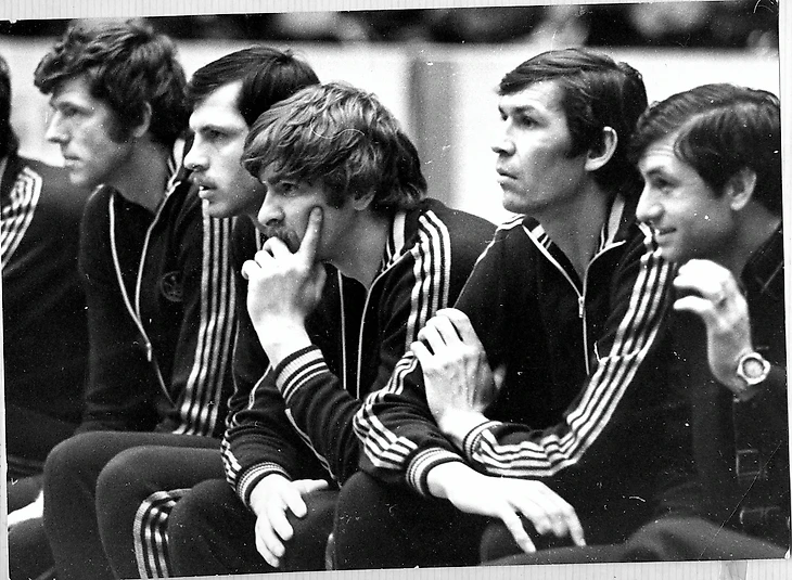 Представляете, каким могучим был ЦСКА, если со скамейки запасных в любой момент могли выйти и усилить игру легендарные чемпионы (слева направо) Сергей Коваленко, Виктор Петраков, Иван Едешко и Алжан Жармухамедов! Рядом с ними – знаменитый массажист Аскер Барчо