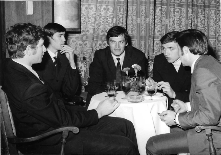 18 апреля 1970. Москва. Прием по случаю окончания первого турнира Гагарина. Слева направо: Иван Едешко, Алжан Жармухамедов, душа компании Александр Болошев, Александр Белов и Анатолий Крикун