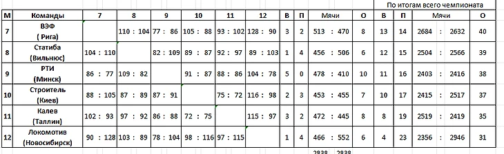 «Статиба» – 11, ВЭФ – 10, «Строитель» – 8, РТИ – 6, «Калев» – 5, «Локомотив» – 3.