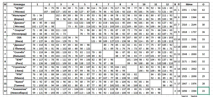 Итак, ЦСКА – 26-1, «Жальгирис» – 19-8, «Динамо» М – 18-9, СКА – 14-13, «Спартак» – 14-13, «Динамо» Тб – 13-14…