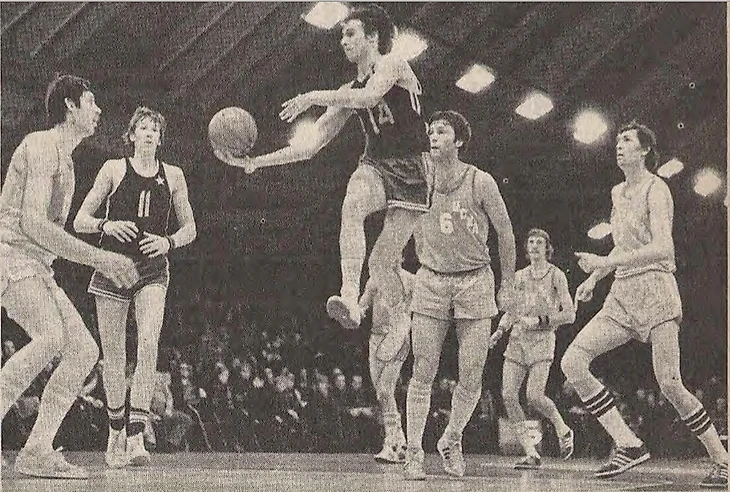 На Олимпиаде в Мюнхене-1972 Александр Болошев принял участие во всех 9 матчах, в том числе в историческом финале (51:50) против США. На фото – его опекают американцы Майкл Бантом (№ 7) и Даг Коллинз