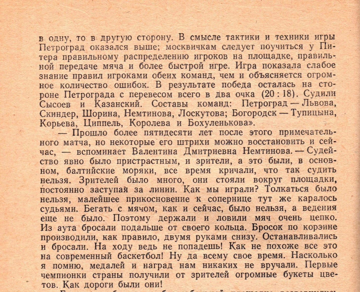 «Судейство явно было пристрастным, и зрители, а это были в основном балтийские моряки, все время кричали, что так судить нельзя. Зрителей было много, они стояли вокруг площадки, постоянно заступая за линии. То и дело слышались реплики игроков, выбрасывающих мяч из аута: «А ну подвинься, а то зацеплю!». Как мы играли? Толкаться было нельзя, малейшее прикосновение к сопернице тут же каралось судьями. Бегать с мячом, как и в современном баскетболе, было нельзя, но тогда и ведения мяча не было. Поэтому держали и ловили мяч очень цепко. Из аута бросали подальше от своего кольца. Бросок по корзине производили, как правило, двумя руками снизу — после остановки. На ходу ведь не попадешь! Медалей и наград победителям и финалистам того чемпионата, насколько я помню, никаких не вручали. Мы как первые чемпионки страны получили от зрителей огромные букеты цветов. Но как дороги были они!»