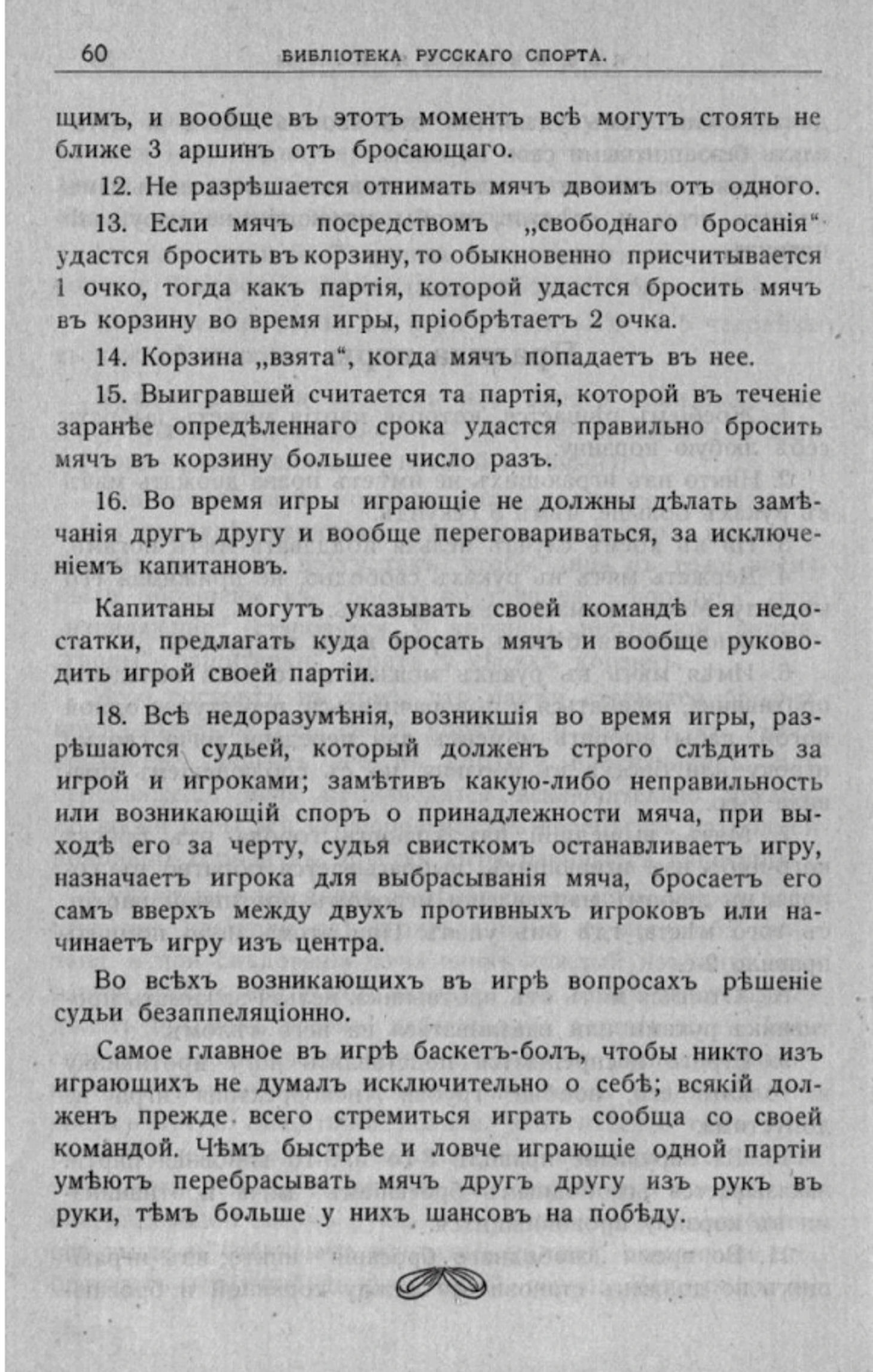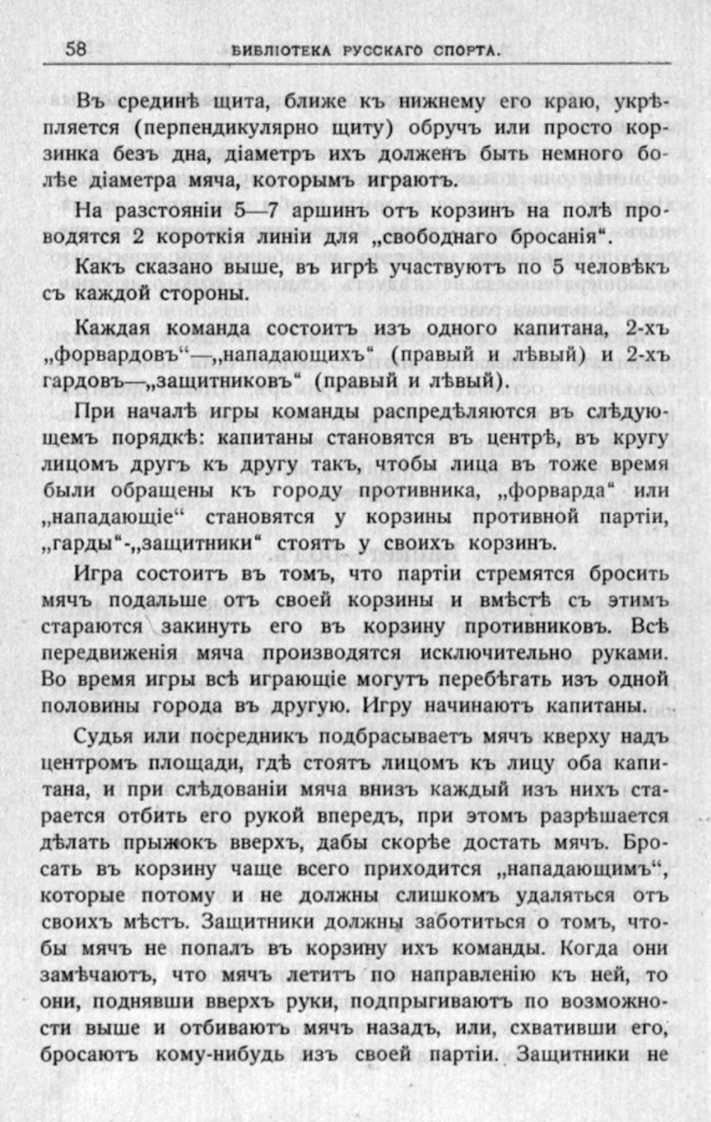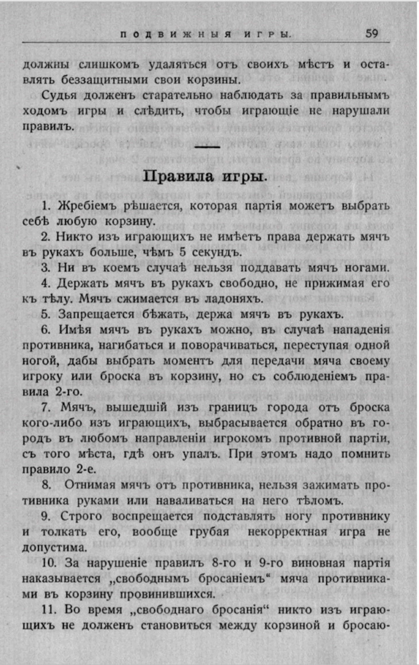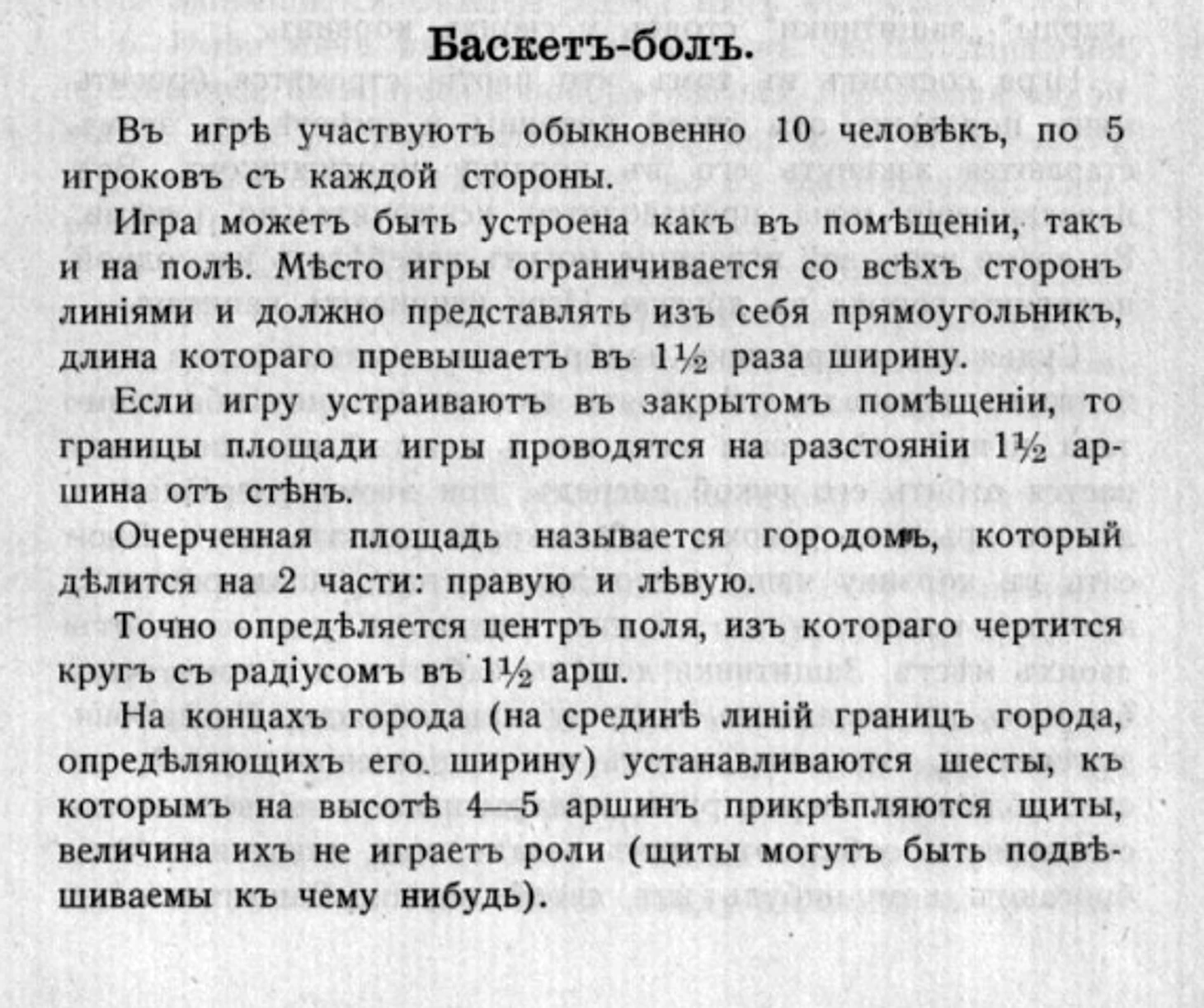 Весной 1911 года в журнале «Библиотека русского спорта» были опубликованы «Правила игры в баскетбол». Не удержимся, приведем их полностью (информацию предоставил Дмитрий Волков).