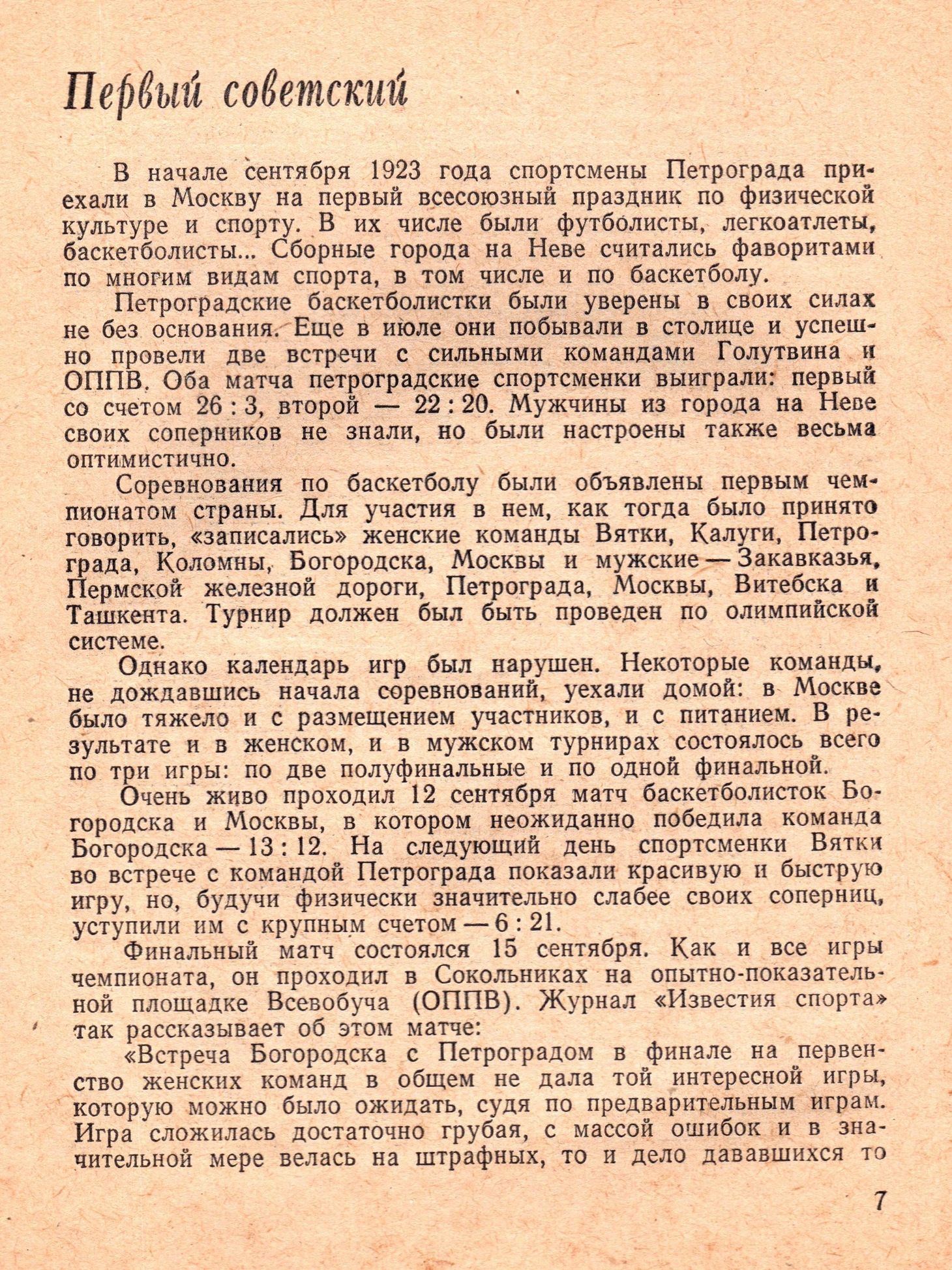 Москва и Петроград — главные центры игры в баскетбол в Советской России. В июле 1923 года баскетболистки Петрограда едут в Москву и дважды выигрывают у сильных команд хозяек: у команды Голутвина (Коломны) — 26:3 и чемпиона города ОППВ — 22:20.