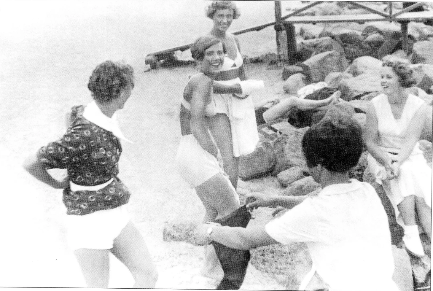 Сборная Москвы — победитель Матча городов СССР 1936 года — отдыхает на берегу Финского залива. Евдокия Рябушкина (крайняя справа, сидит на камне), далее по часовой стрелке: Вера Бессонова, М. Горшкова, Вера Тетерина, Татьяна Агейкова. Нет на снимке Екатерины Мефодьевой и Мэри Карасевой