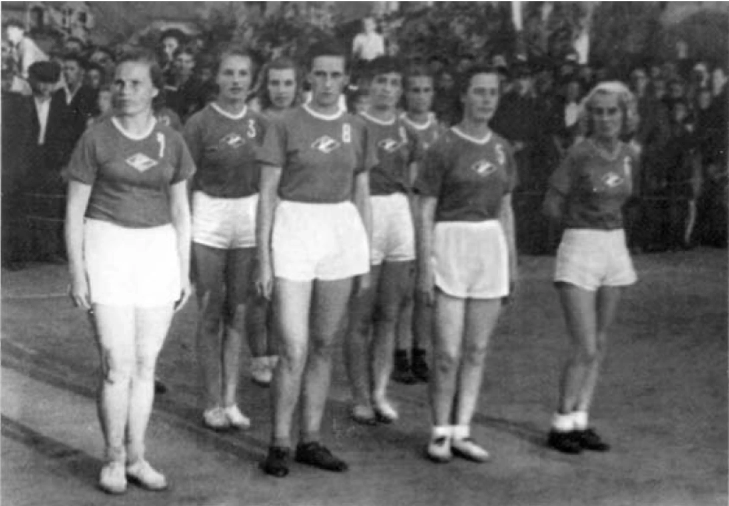 13 сентября 1936. Москва. Стадион «Локомотив». «Локомотив» (Москва) — победитель первенства ВЦСПС 1936 года (слева направо): Мэри Карасева, Татьяна Агейкова (капитан), Мария Козлова, Мария Титова, Евдокия Рябушкина