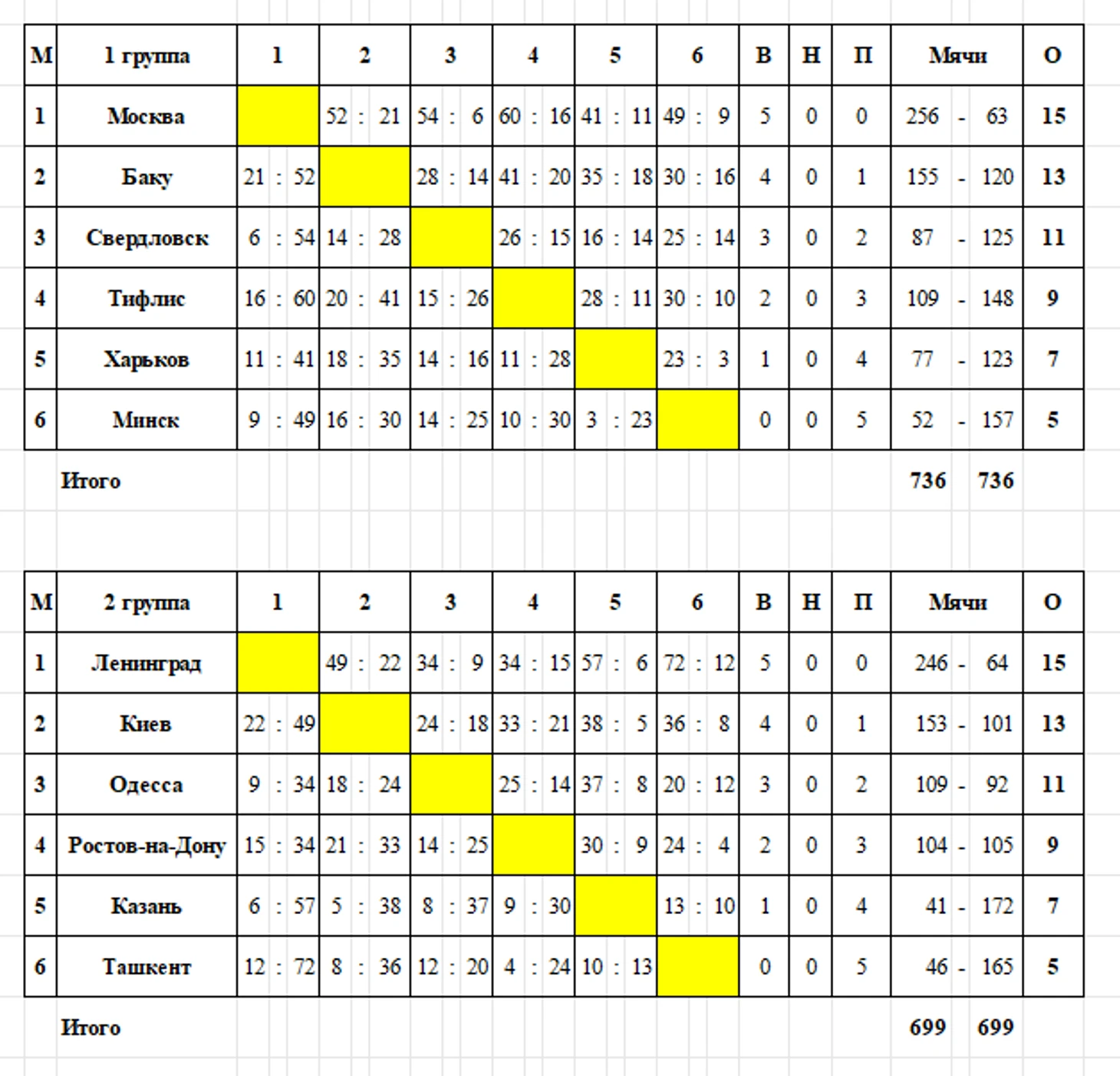 Итоговая классификация VI чемпионата СССР. 1. Москва. 2. Ленинград. 3. Баку. 4. Киев. 5. Свердловск. 6. Одесса. 7. Тифлис. 8. Ростов-на-Дону. 9. Харьков. 10. Казань. 11. Минск. 12. Ташкент
