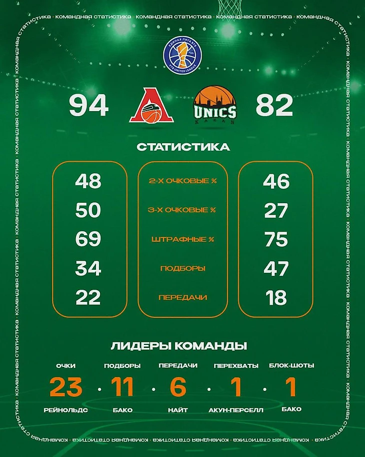 Самыми результативными и эффективными в составе «УНИКСа» стали Джален Рейнольдс (23 + 8 подборов, КПИ = 27) и Исмаэль БАКО, оформивший дабл-дабл из 18 очков и 11 подборов (КПИ = 27). В активе ДеВона Акун-Перселла 14 очков, 5 подборов и 2 передачи.