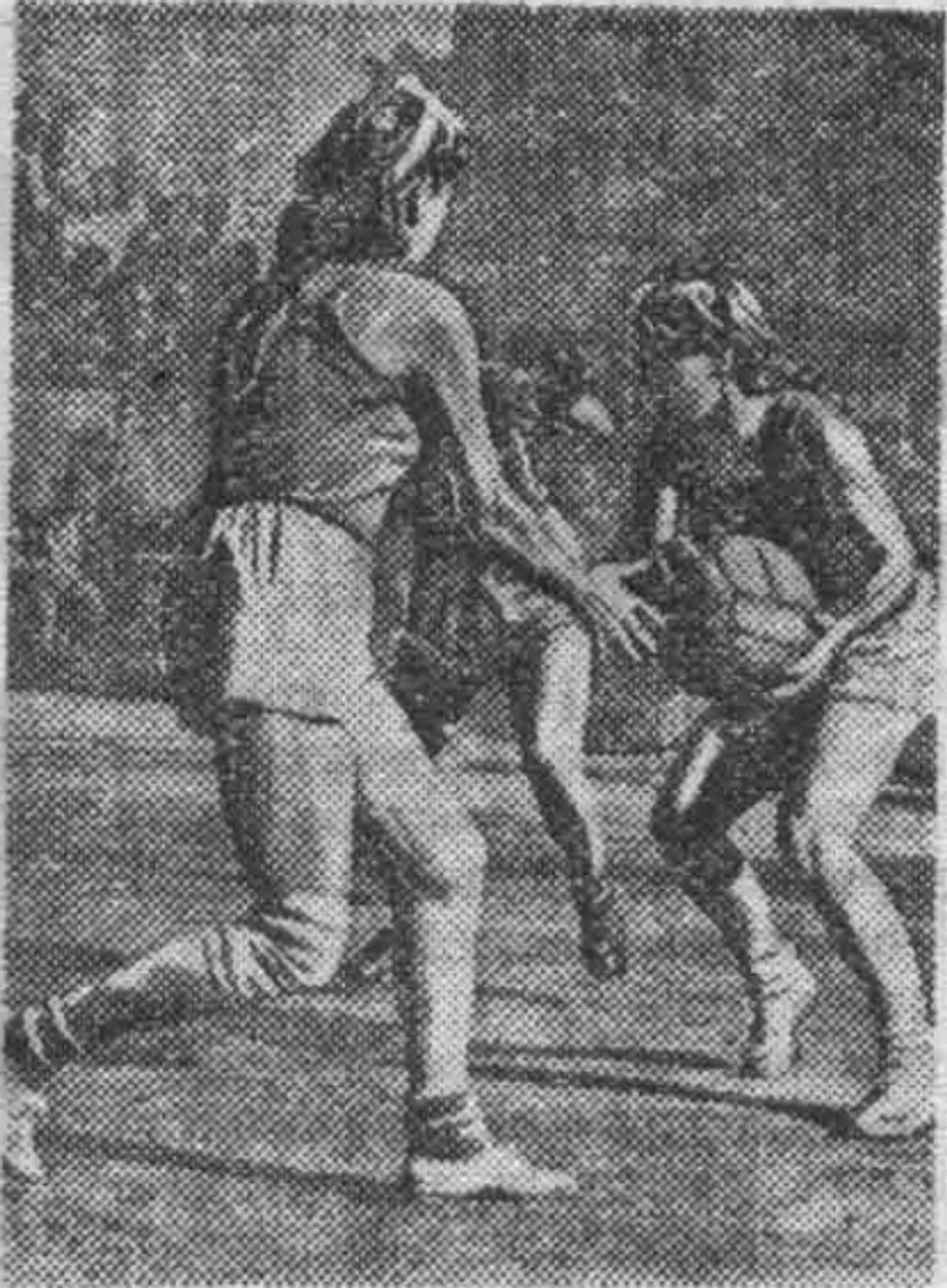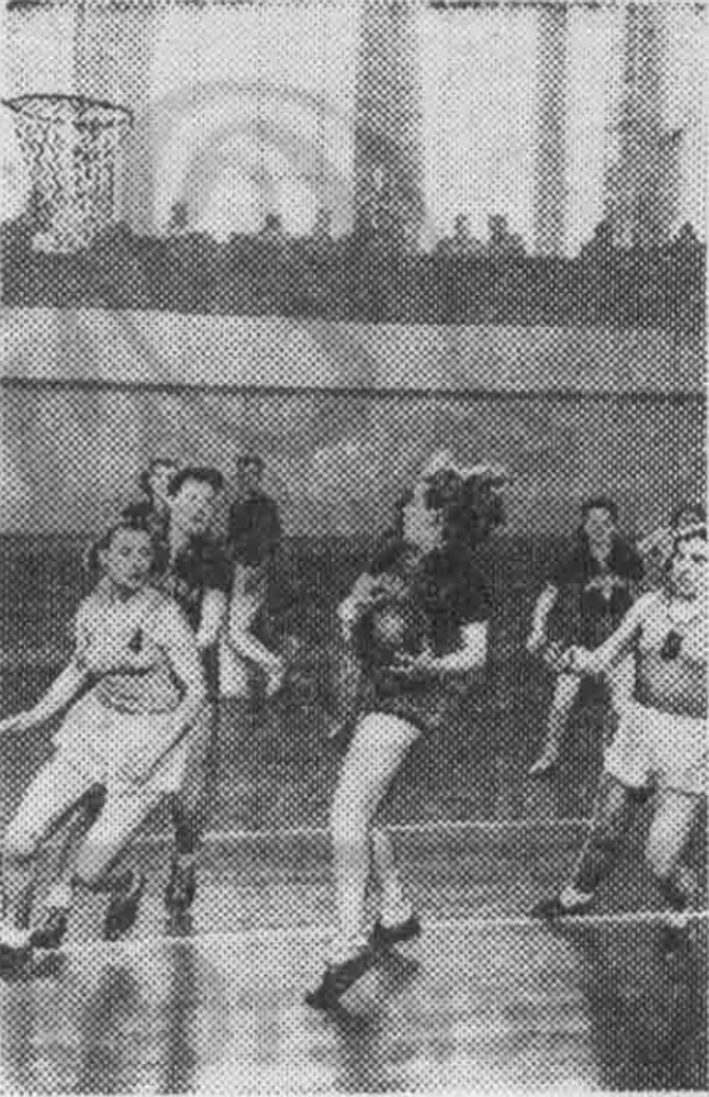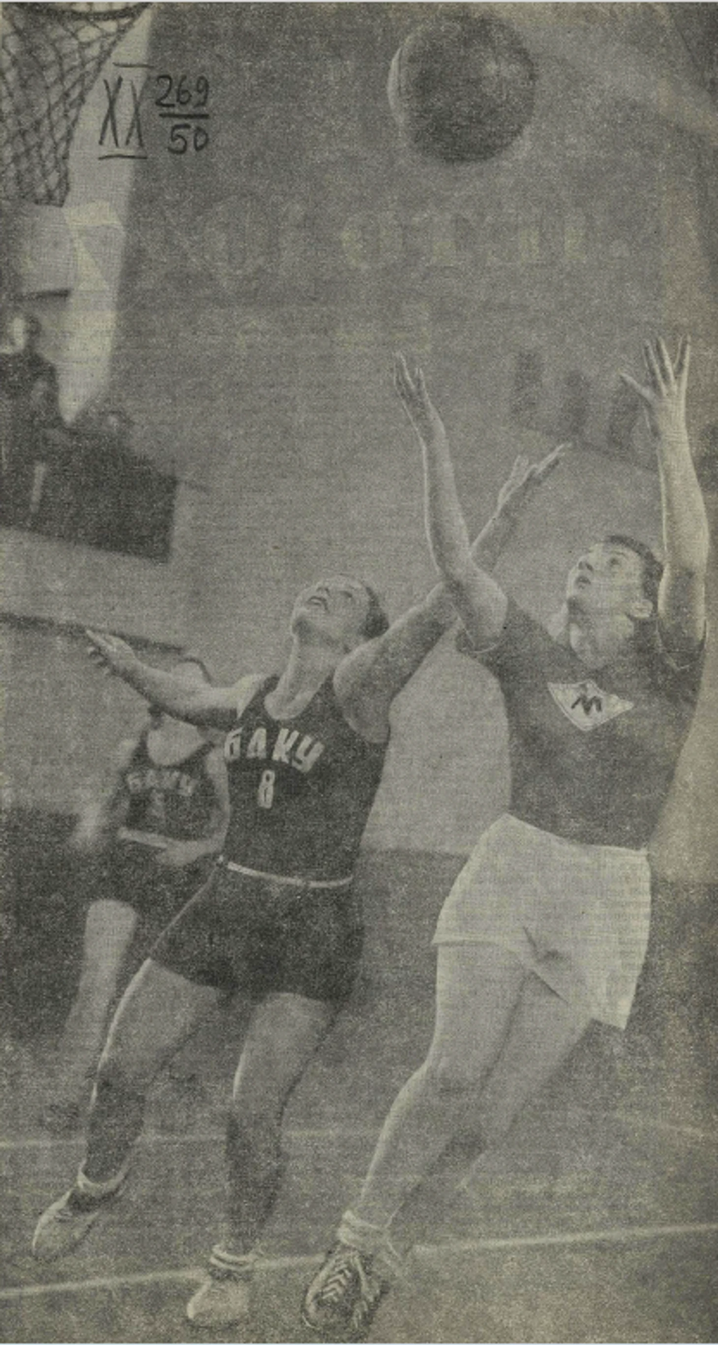 9 марта 1947. Москва. Зал спортклуба «Крылья Советов». Игра VIII Матча городов СССР Москва — Баку — 46:20. Капитан сборной Москвы Мария Козлова (справа) борется за мяч с Фоминой из Баку