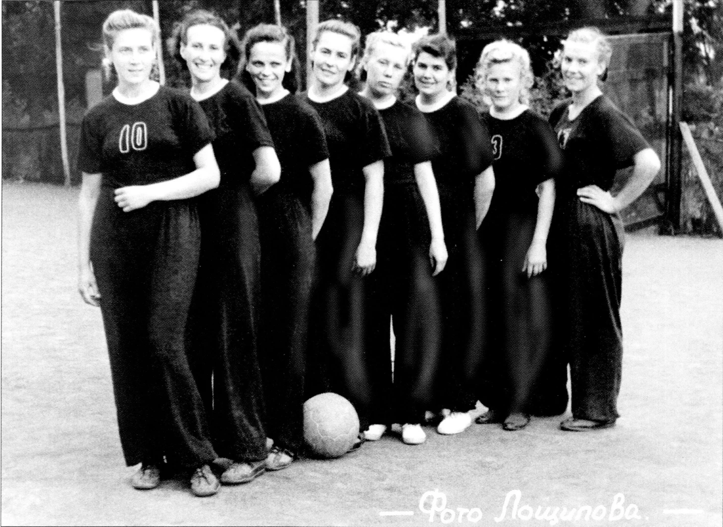 Московский «Строитель» образца 1947 года. Слева направо Г. Калмыкова, А. Тарасова, С. Виноградова, Е. Кутузова, Е. Анисимова, Л. Притулова, М. Реутова, Г. Степина (Ярошевская). На фото отсутствует Тамара Моисеева — во время съемки она была в расположении сборной