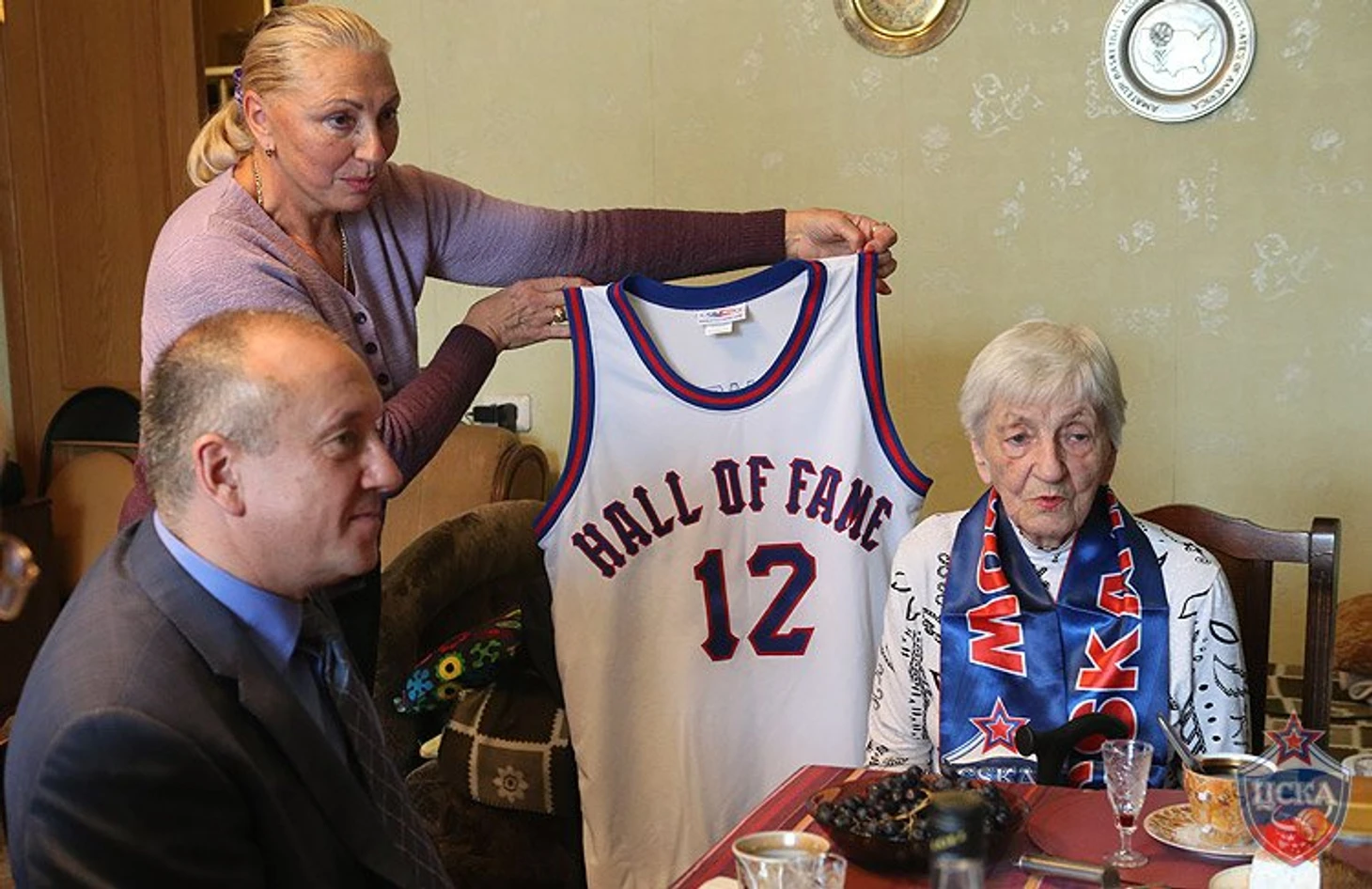 Октябрь 2012 года. Представители клуба ЦСКА поздравляют Лидию Алексееву с введением в Зал славы баскетболы имени Джеймса Нейсмита