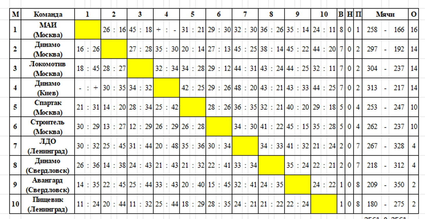 Встреча МАИ (Москва) — «Динамо» (Киев) прекращена при счете 43:25 в пользу МАИ после того, как команда Киева из-за удалений игроков осталась на площадке втроем.
