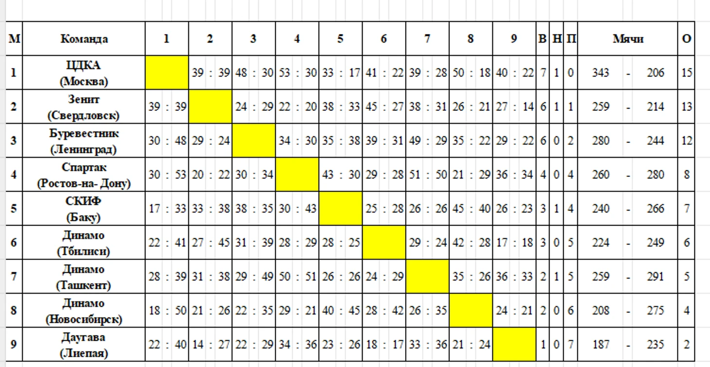 1. «Спартак» (Ростов-на-Дону). 2. «Зенит» (Свердловск). 3. «Динамо» (Новосибирск). 4. «Динамо» (Ленинградская обл.). 5. «Спартак» (Казань). 6. «Спартак» (Владивосток). 7. Военно-воздушная академия (Монино, Московская обл.). 8. «Большевик» (Саратов). 9. Дом офицеров (Симферополь).
