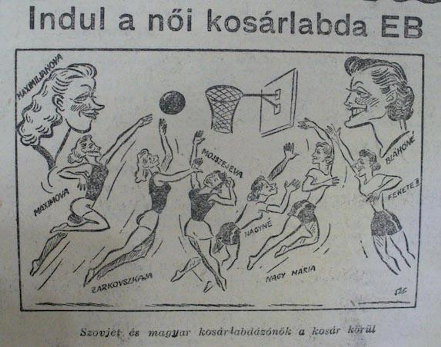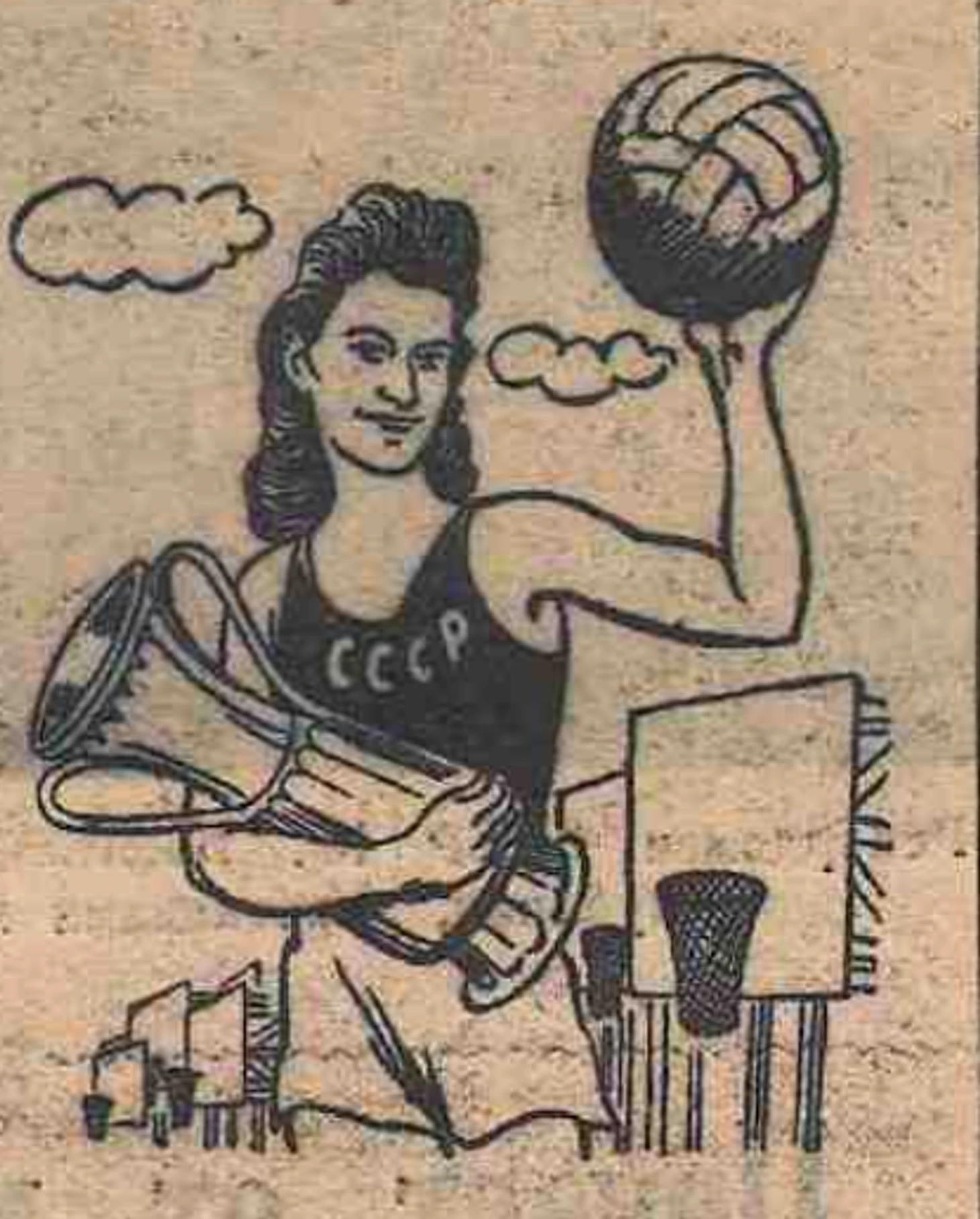 Май 1950. Будапешт, Венгрия. Так венгерские художники изобразили капитана сборной СССР Лидию Алексееву с кубком чемпионов Европы