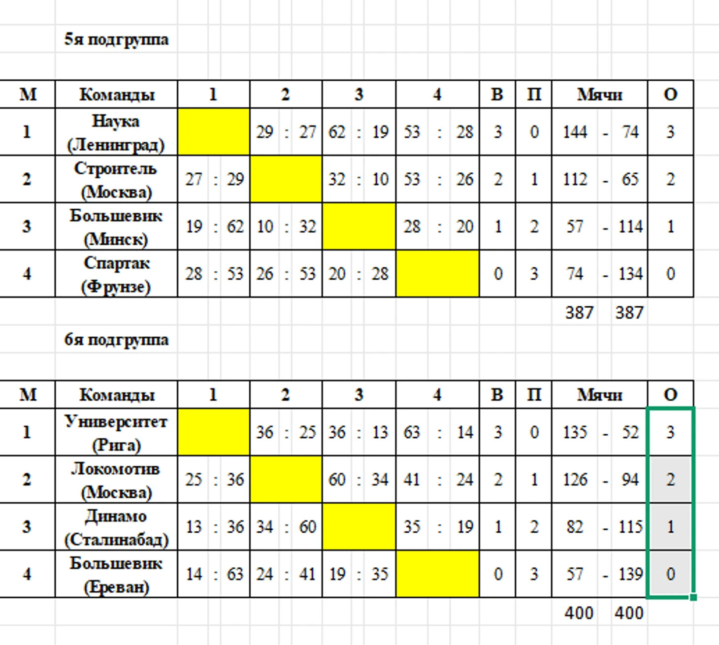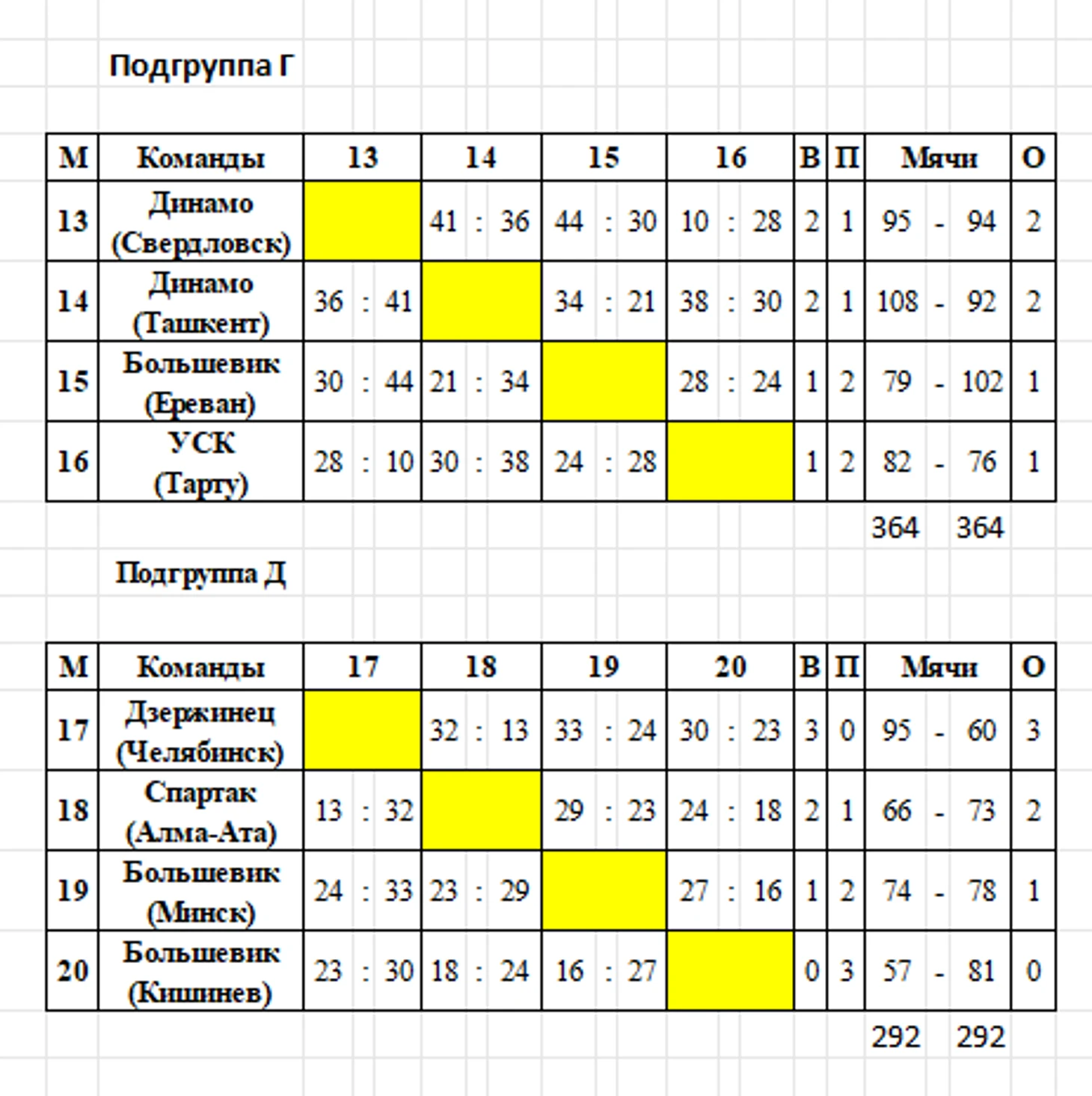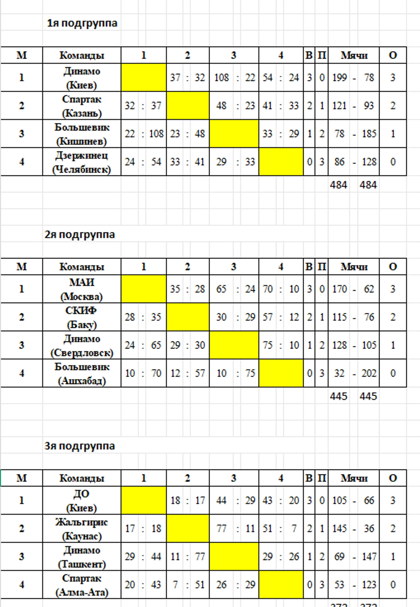 После уверенной победы над Киевом (вспомним, что «Динамо» — действующий чемпион страны) — 31:24, стало понятно, что Рига поднимется как никогда высоко, даже несмотря на поражение 18:19 от Ленинграда. В итоге Рига, Ленинград и Киев набрали одинаковое количество очков, но у команды Латвии оказалась лучше разница мячей.