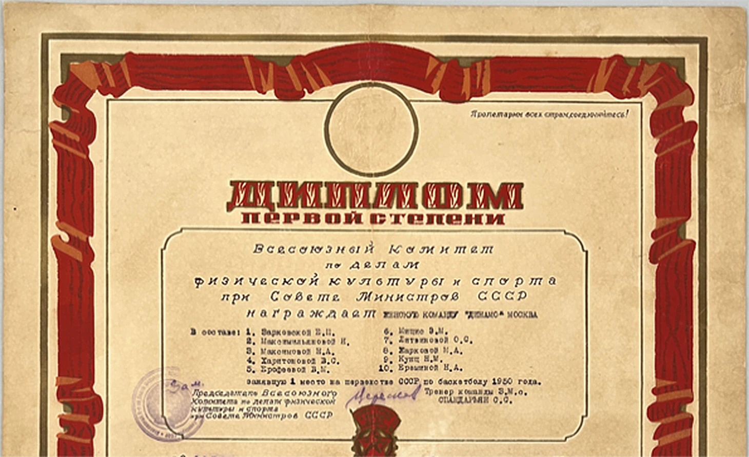 Диплом первой степени для команды-победительницы чемпионата СССР — «Динамо» (Москва)