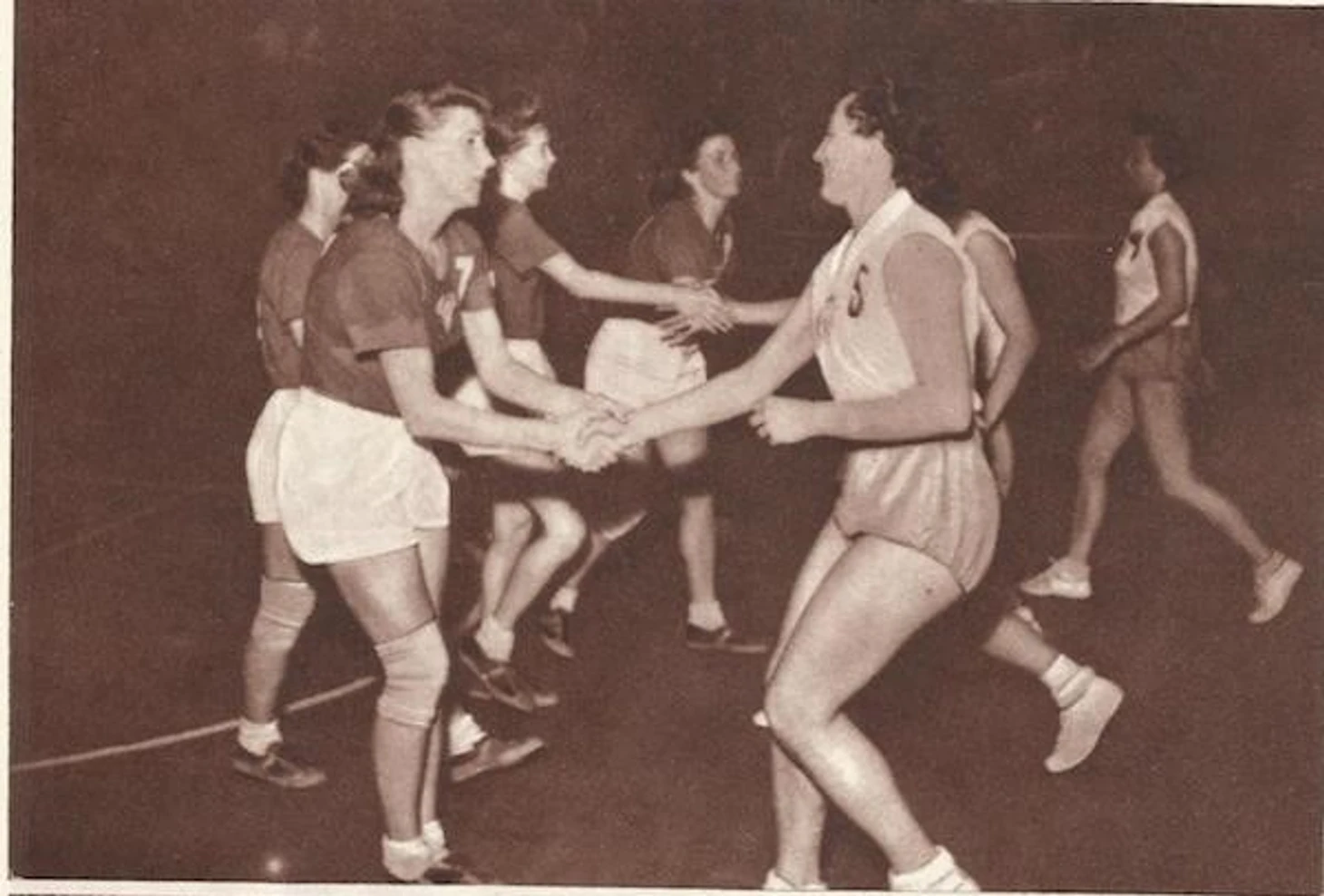 20 мая 1950. Будапешт, Венгрия. II чемпионат Европы. СССР — Венгрия — 45:32. Рукопожатие перед финалом. На первом плане капитаны — Лидия Алексеева и Анна Чуч-Ремакне