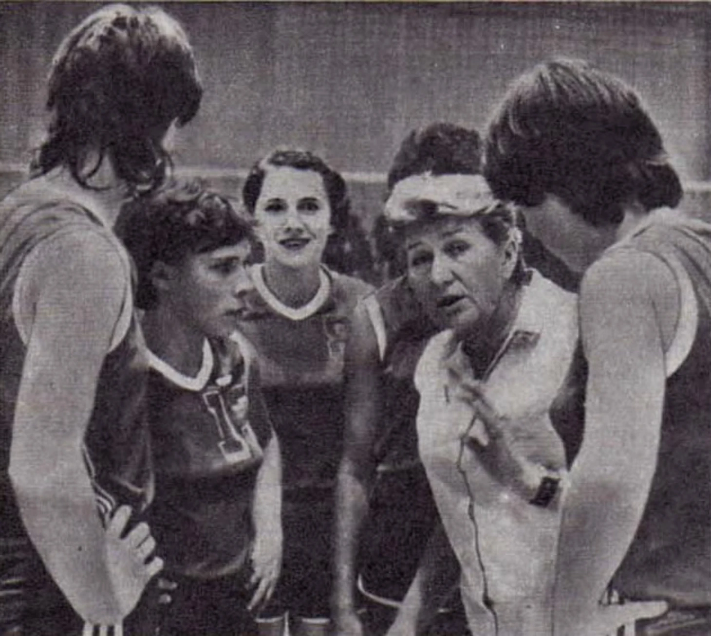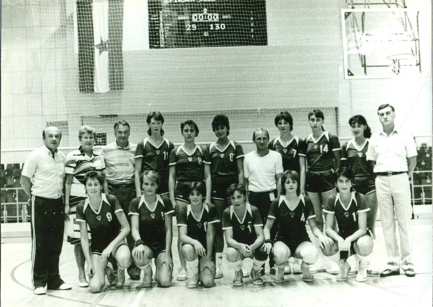 20 июля 1985. Тузла, Югославия. Чемпионат Европы среди девушек. Предварительный этап. СССР — Румыния — 68:63. Старший тренер сборной СССР Нина Максимова взяла тайм-аут. Слева направо: Елена Мозговая, Людмила Коновалова, Елена Жирко, Наталья Засульская