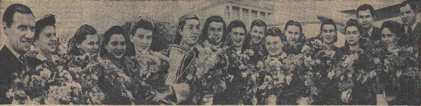 25 мая 1950. Москва. Аэродром Внуково. Встреча сборной СССР — чемпионок Европы 1950. Слева направо: Игорь Беляев (судья), З. Романова (глава делегации), Вера Шендель, Вера Харитонова, Лидия Алексеева, Раиса Маментьева, Зоя Стасюк, Валентина Копылова, Hина Максимова, Юлия Бурдина, Нина Максимельянова, Тамара Моисеева, Евгения Зарковская, Константин Травин (тренер), Евдокия Рябушкина и Витаутас Кулакаускас (тренер)