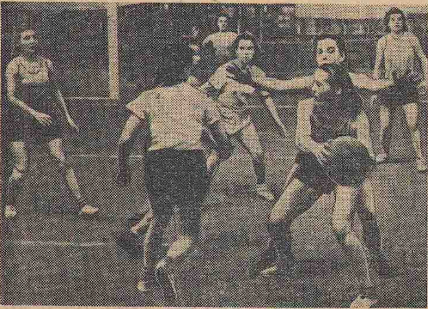 26 октября 1957. Рио-де-Жанейро, Бразилия. Чемпионат мира. Финальный раунд. СССР — США — 48:51. Нина Максимова (№ 4) и Валентина Копылова (№ 6) пытаются выиграть борьбу под щитом у Джоанн Кроуфорд (№ 5) и Неры Уайт (№ 7)