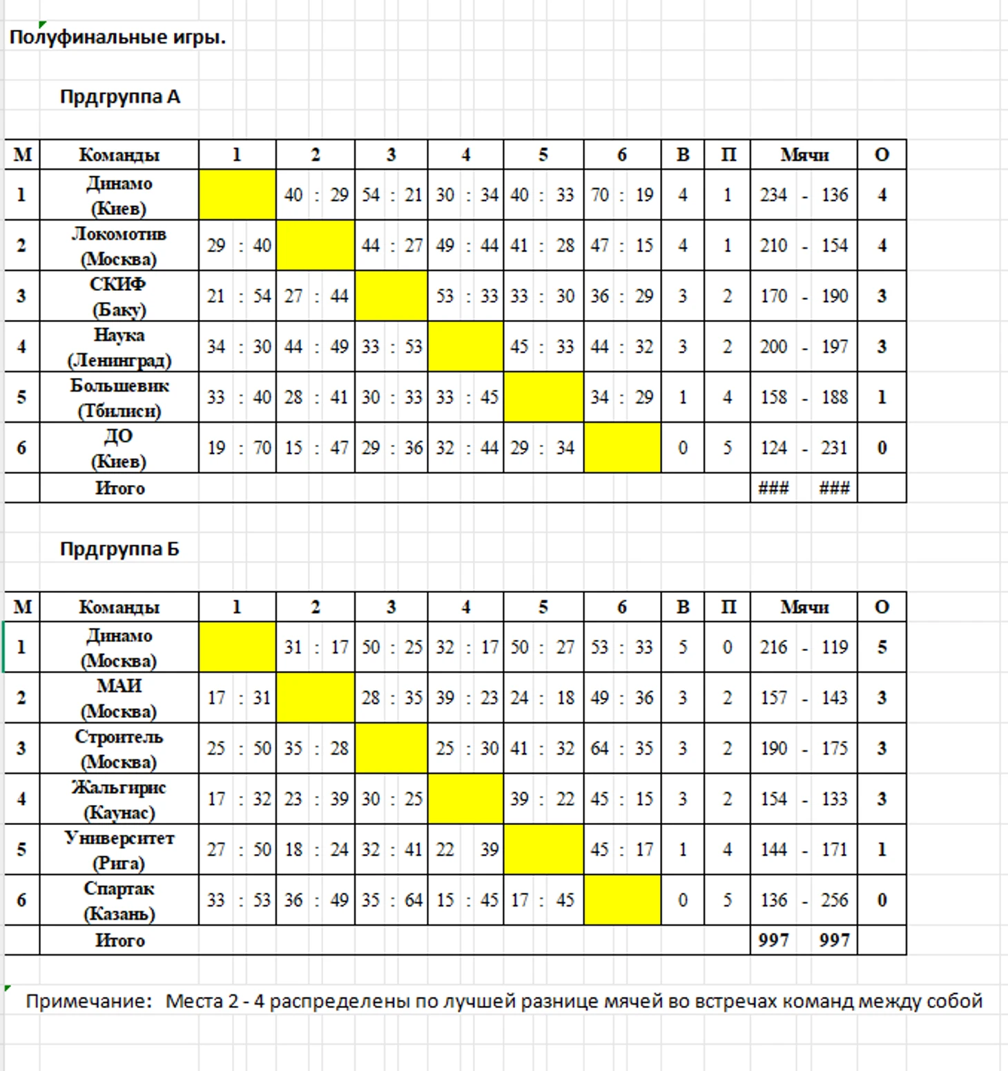 1/2 финала. Москва. 12 июля. «Динамо» (Киев) – «Наука» (Ленинград) – 61:37. МАИ (Москва) – Сельхозакадемия (Рига) – 49:29.
