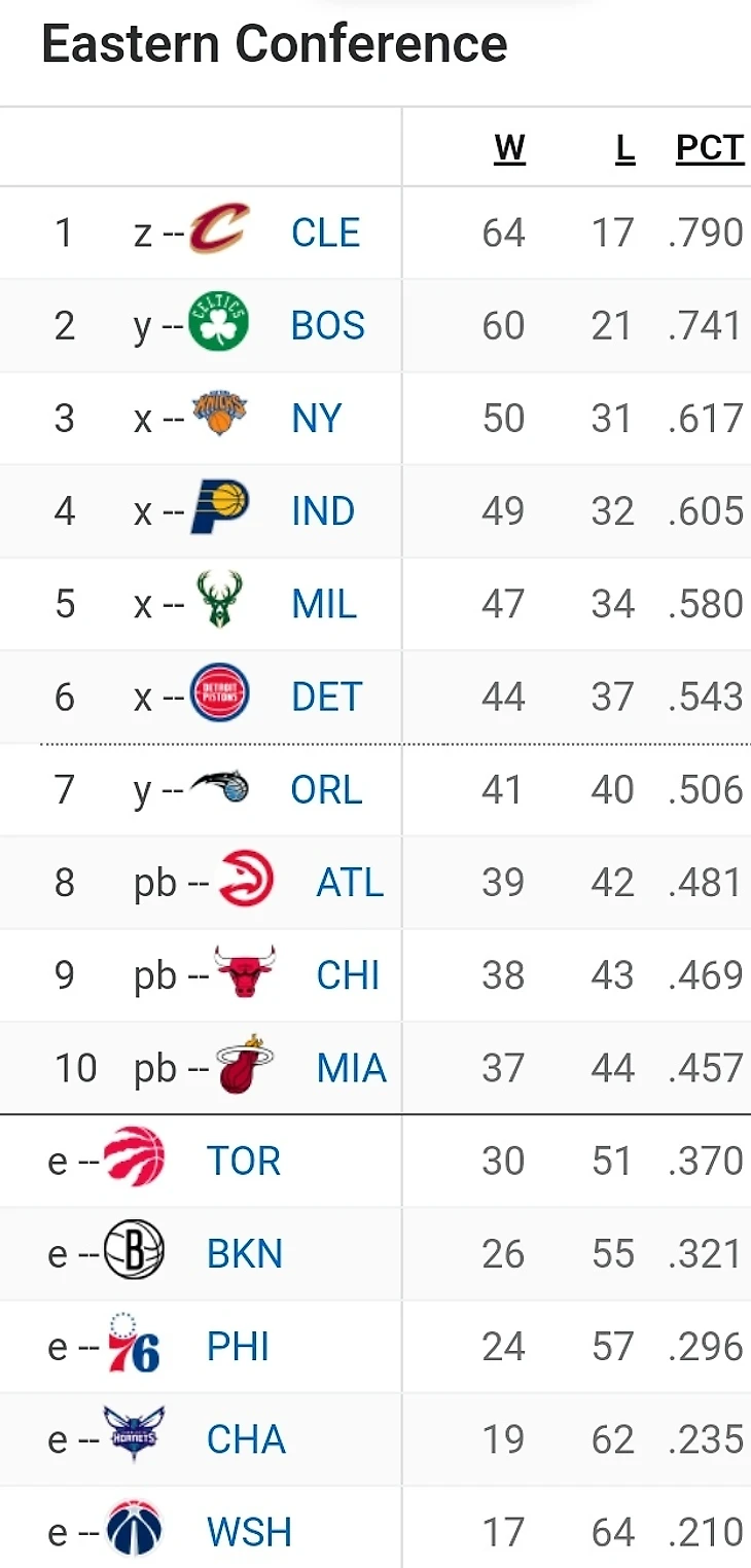 Может вы знаете, почему espn, с сайта которого вы добавили таблицы а в пост, указывает напротив NY, IND, MIL, DET символ “x”, хотя там все уже понятно, а напротив LAL символ “y”?