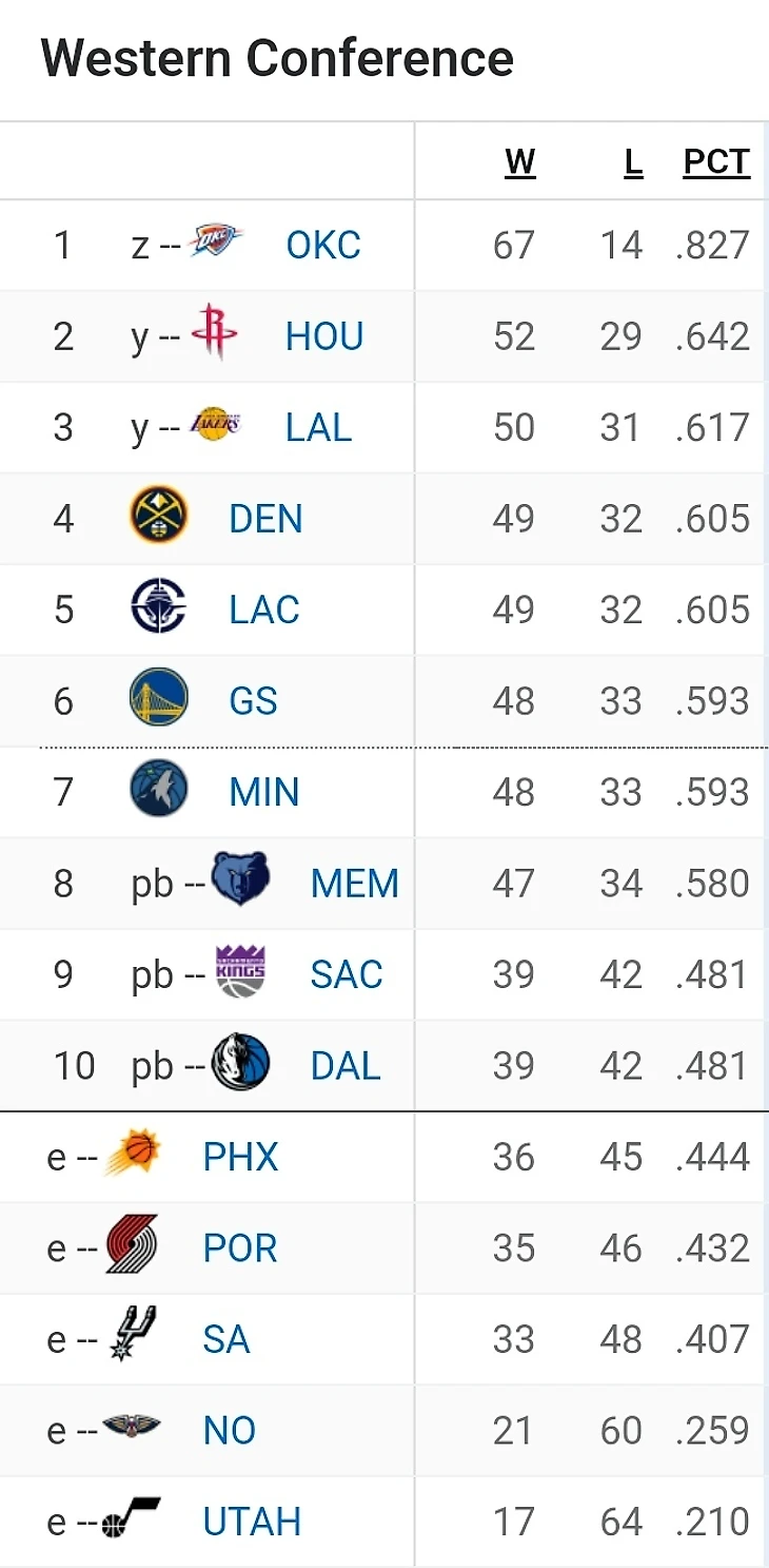 - Денвер (49) < Хьюстон, Миннесота (49) > Юта, Клипперс (50) > ГСВ (48): Наггетс будут 6, потому что Тимбервулвз их свипнули в сезонной серии.
