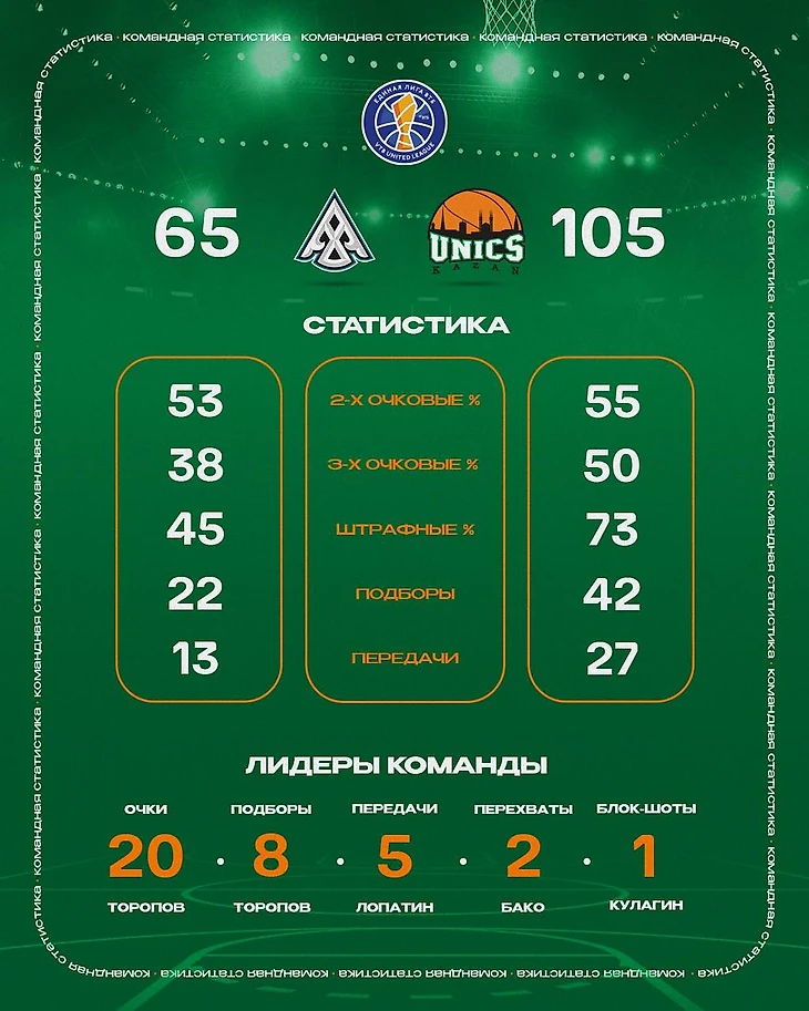 Подопечные Велимира Перасовича c высоким процентом атаковали из-за дуги (50%, 11/22 трехочковых) и выиграли каждую из четвертей, установив командный рекорд сезона по результативности в отдельно взятом периоде – 38 очков во второй десятиминутке. Казанцы превзошли хозяев по всем статистическим показателям: забрали на 20 подборов больше (42 к 22), отдали вдвое больше результативных передач (27 против 13) и вынудили соперника совершить гораздо больше потерь (14 к 6).