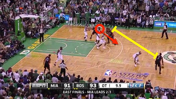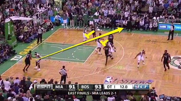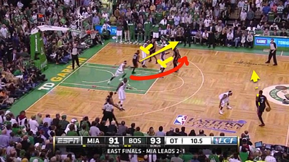Споэльстра был готов к тому, что мяч к Чалмерсу не дойдет (хотя и полагал, что это случится из-за защиты «Бостона»). После того как передача не проходит, Чалмерс уходит в угол, освобождая пространство, Баттье же выходит и ставит заслон для Уэйда. Происходит размен, в результате которого Маркиз Дэниэлс остается с Уэйдом, а Рондо – с Баттье.