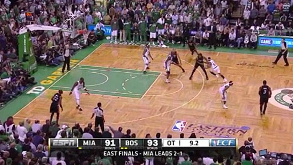Уэйд смещается на крыло, делает ложное движение и совершает бросок. Он промахивается, и «Бостон» сравнивает счет в серии. Вот этот момент: